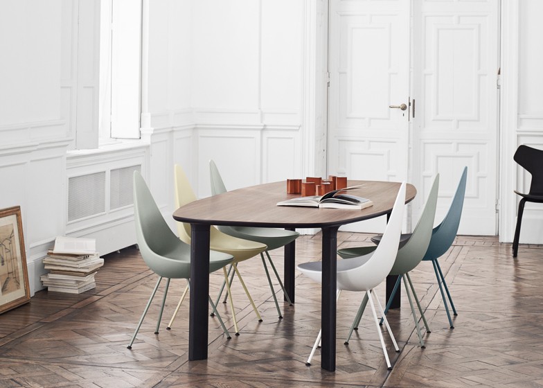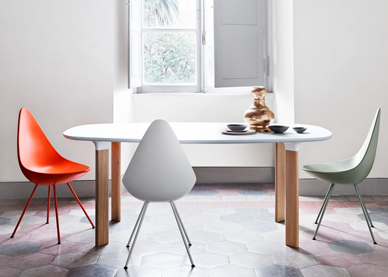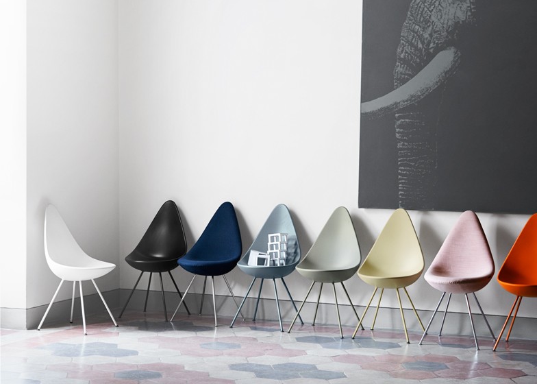 Po tem, ko je podjetje Republic of Fritz Hansen aprila letos na milanskem pohištvenem sejmu oznanilo, da bodo obudili produkcijo klasičnega stola Drop je le-ta pred kratkim končno prispel na trg. Stol je danvega leta 1958 zasnoval Arne Jacobsen, eden vidnejših arhitektov modernistične dobe. V osnovi so bili stoli Drop, Swan in Egg narejeni v omejeni izdaji ekskluzivno za opremo Radisson Scandinavian System Hotela v Kopenhagnu, Stola Swan in Egg sta kmalu šla v množično proizvodnjo in postala kultna oblikvalska kosa, elegantnen Drop pa je do danes utonil v pozabo.