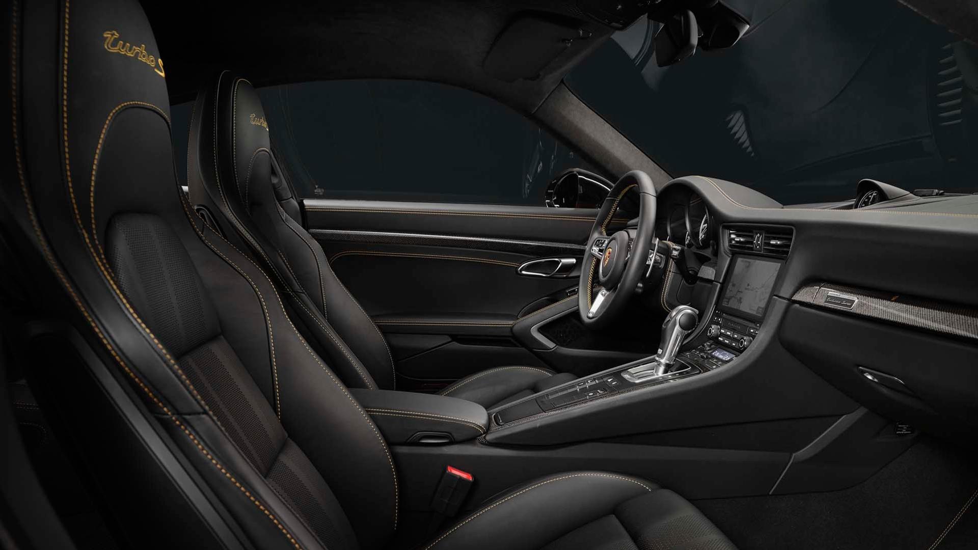 Sedeži, ki se med drugim premikajo v 18 smereh, so dobili dvojo perforirano usnje z močno opazno zlato črto, ki daje kontrast zunanjosti avtomobila. Ostalo oblazinjenje je iz alkantare, šivi pa so živo rumeni. Na vzglavnikih boste našli izvezen napis Turbo S, seveda v rumeni barvi, ki je hkrati tudi edina možnost notranjosti. V avtomobilu je moč zaslediti tudi tablico z napisom, da gre za ekskluzivno serijo.