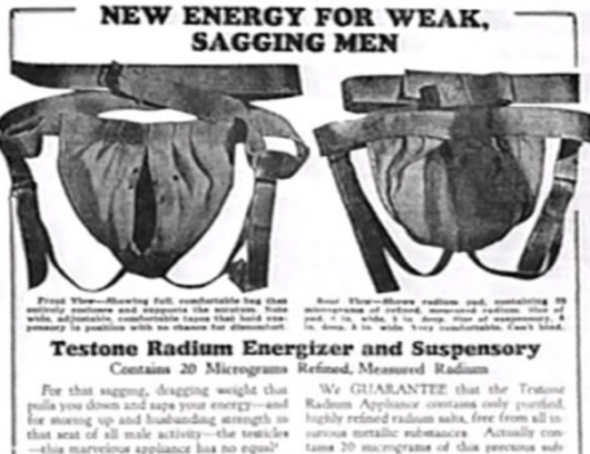 Dokaz, da je treba nove tehnologije uvajati počasi. Torej, ljudje so leta 1910 verjeli, da bodo, če jim bo iz testisov viselo 20 mikrogramov rafiniranega radija, postali bolj možati.