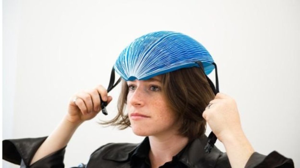 Capacete ecológico isso é capacete de bicicleta dobrável feito de papelão para uso único. Isis Shiffer ela conseguiu porque estava cansada de carregar seu desajeitado capacete de bicicleta.