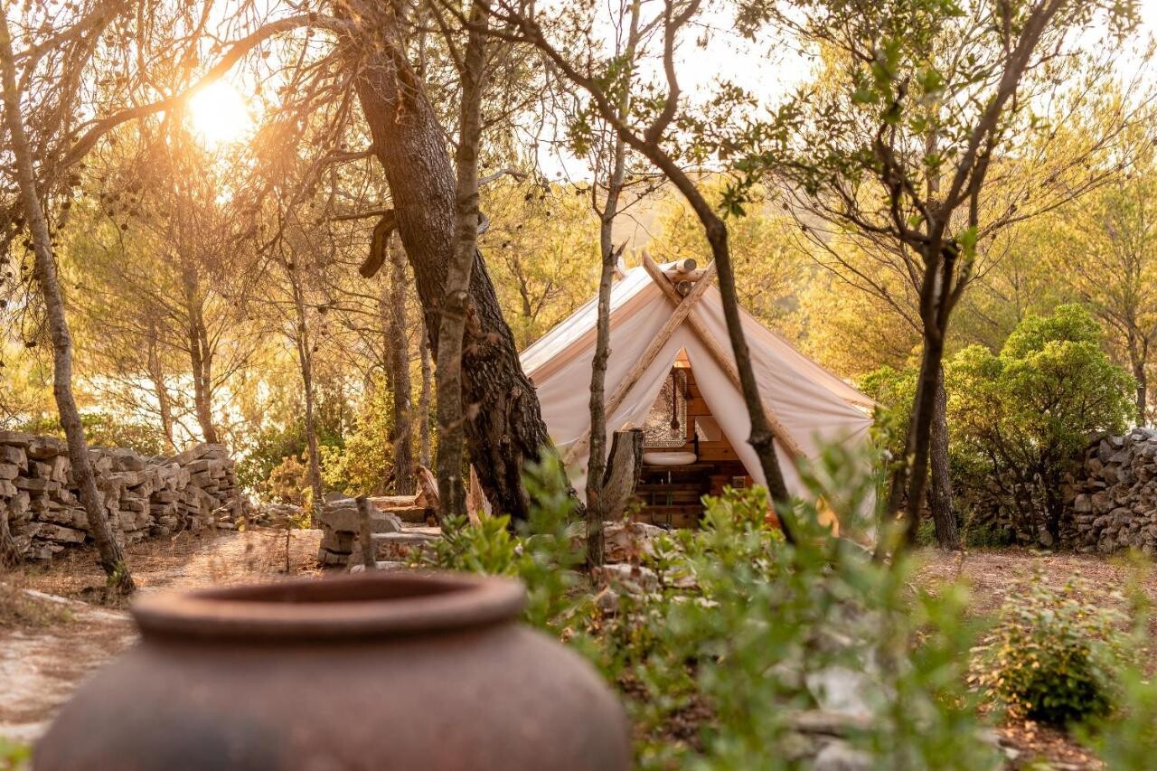 O luxuoso site de glamping Plage Cachee está localizado em Vrboska, na ilha de Hvar. Situa-se no seio de uma floresta perfumada, que permite aos hóspedes acordar de manhã com o cheiro dos pinheiros e as fragrâncias mediterrânicas. Apenas cinco tendas são projetadas como parte do glamping, o que permite aos hóspedes total privacidade e tranquilidade. Eles são decorados com bom gosto e cuidadosamente e oferecem tudo que você precisa para umas férias perfeitas na costa da Dalmácia.