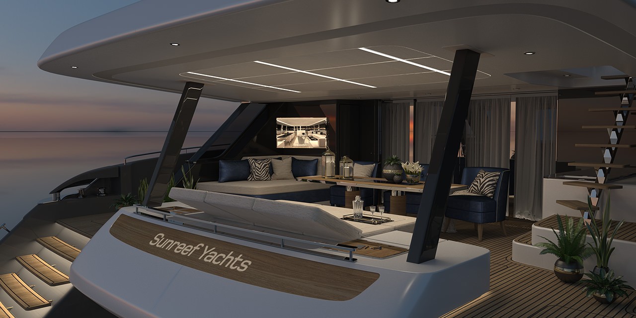 O catamarã personalizado possui um design totalmente moderno, realçado por janelas de aço inoxidável e piso de madeira de teca. A grande garagem tem espaço suficiente para muitos 'brinquedos' motorizados - destina-se principalmente viagens mais longas, e seu deck é flexível e oferece opções como bar e cozinha aberta.