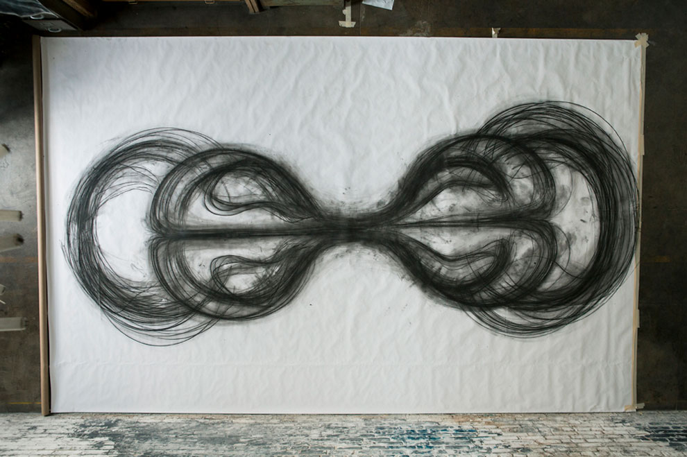 Cria com carvãoE o resultado é uma arte abstrata que, durante a performance de dança, se transforma de uma dança em um "estado agregado" artístico. Você pode ver as obras dela abaixo e as dela acima. apresentação de dança, que é ao mesmo tempo um processo a criação de uma imagem artística.