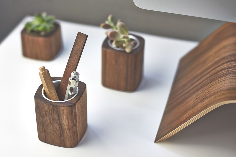 Os produtos são feitos de madeira de nogueira ou bordo, e suas linhas arredondadas os tornam extremamente agradáveis ao toque, trazendo um toque de estilo moderno e natural ao ambiente de trabalho. A coleção é composta por suporte para monitor, bandeja para teclado, mouse pad, régua, porta-canetas, porta-clips, vaso de flores, luminária e suporte para celular. Todos os produtos possuem design ergonômico, garantindo um uso particularmente confortável.