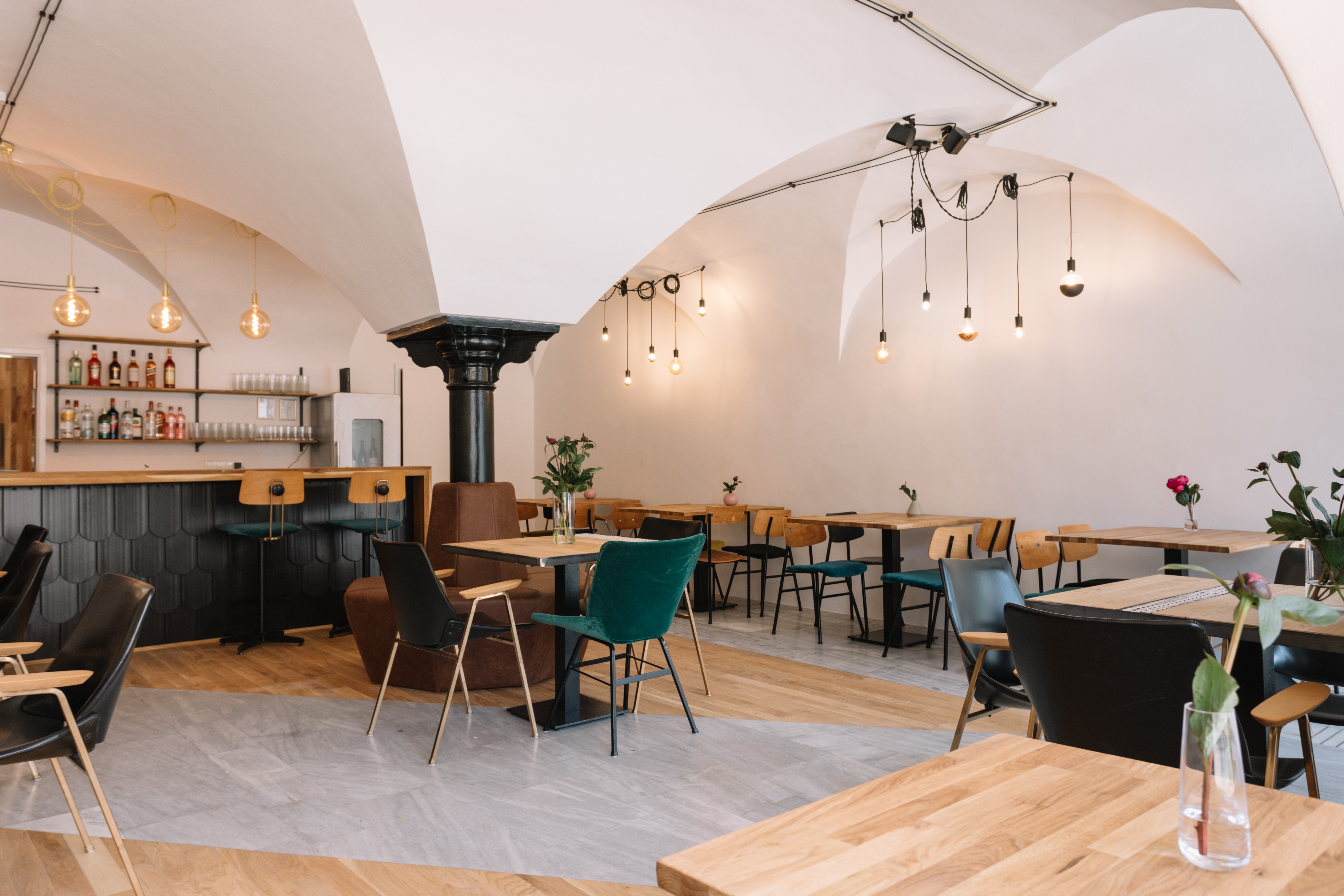 Onde está hoje Alexandre bistrô, já foi uma sapataria. O espaço como tal não foi adaptado a um restaurante. Ana e Klemen mantiveram alguns elementos da sala - por exemplo, o piso original (pedra mármore), que incluímos parquete de carvalho oleado, que é também o fio condutor de todo o interior. Além disso, são todos originais arcos e uma poderosa coluna no meio da barra, que agora tem uma nova função, ou seja, um assento aconchegante. Acima de tudo, era importante para eles preservar o patrimônio cultural da região.
