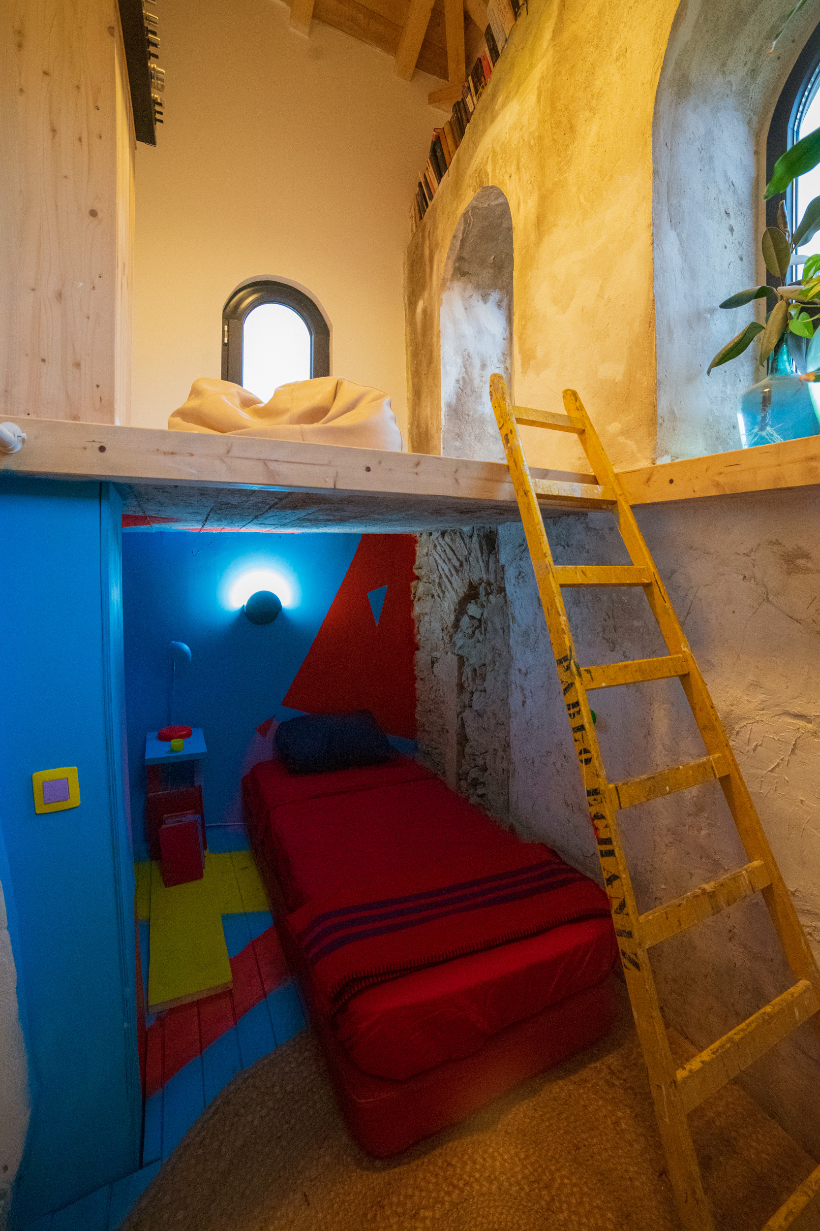 A vista escapa da sala para cima em direção ao antigo coro, hoje galeria envidraçada, onde, tal como na montra, existe um quarto separado, ao qual se acede por uma escada de madeira. Neste piso encontra-se um estúdio e duas casas de banho. Do estúdio, você chega ao campanário - um pequeno "loft" onde inicialmente colocou sua cama e livros como um ótimo lugar para mergulhar em sua leitura favorita com vista para as colinas verdes.