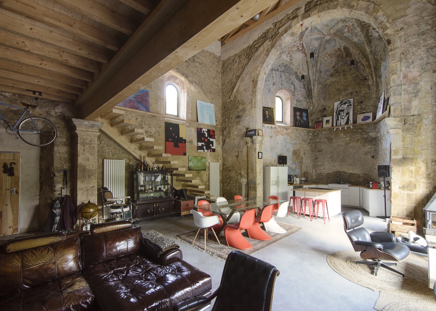 Acima de dois terços da casa há um pé-direito de 10 metros de altura, onde a sala de jantar e a sala de estar são a parte central e a cozinha fica em semicírculo - no local do antigo altar. Esta área comum também possui uma grande lareira a lenha.