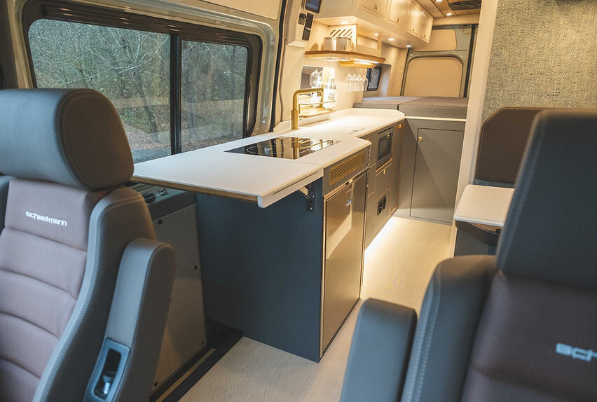 V Van BAM cada centímetro quadrado é projetado pensando no conforto e na versatilidade. Desde a disposição modular, que permite adaptar o espaço ao número de passageiros e às necessidades da viagem, até à cozinha cuidadosamente desenhada com fogão de dupla indução, frigorífico grande Isotherm 130 e lava-loiça funda. Quer esteja a preparar uma refeição ou a precisar de espaço de trabalho extra, cada elemento foi concebido para maximizar a utilidade e o conforto. A estética, que está muito em sintonia com o momento e as tendências, também é interessante. Elogiamos também alguns detalhes inovadores, como o interessante suporte para taças de vinho.