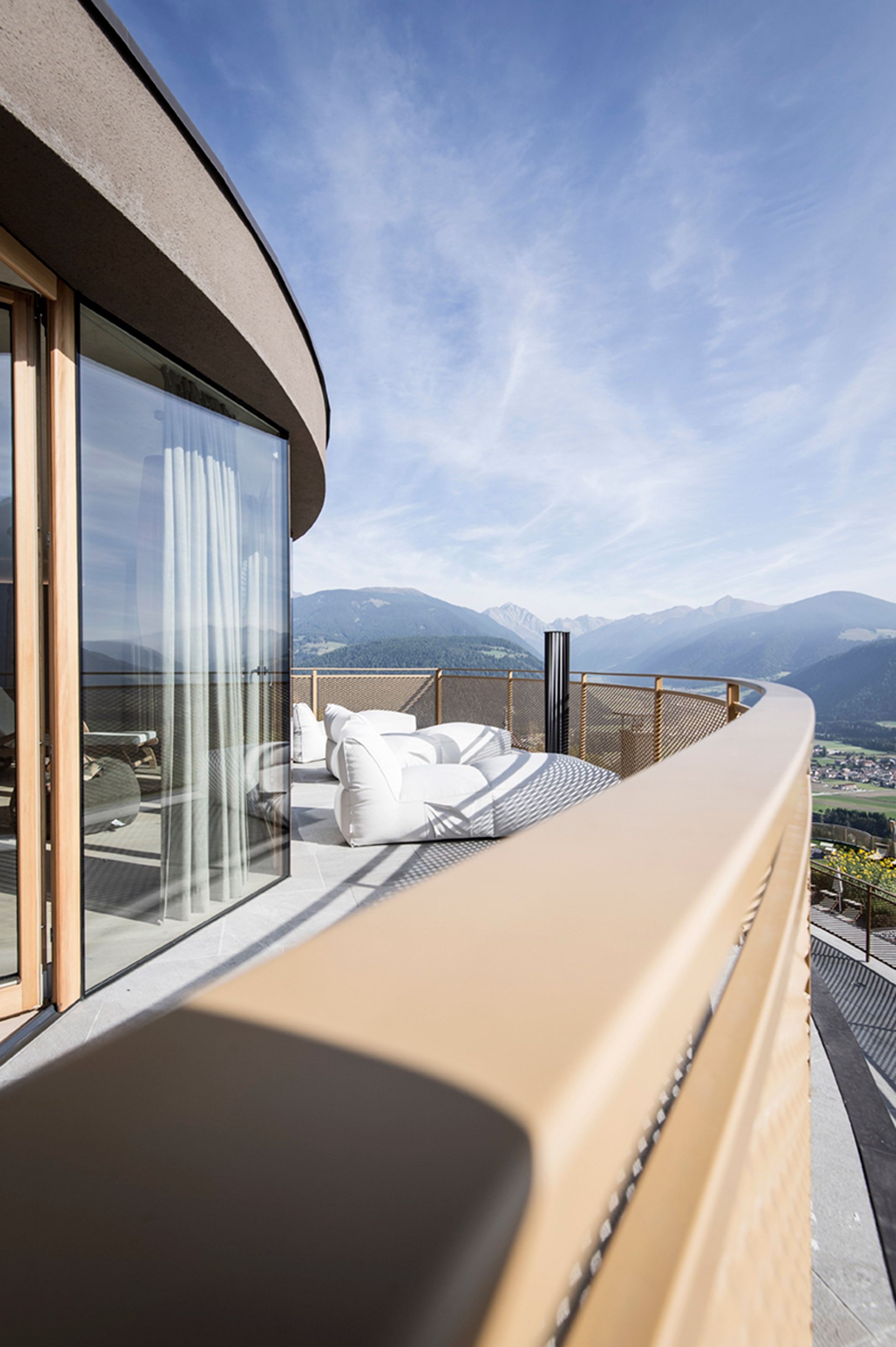 Estúdio de arquitetura NOÉ é para hotel Hubertus v italijanskem Kronplatzu, ki velja za priljubljeno pribežališče smučarjev in pohodnikov, izdelal previsno ploščad z zunanjim bazenom, ki ponuja prečudovit razgled na Dolomite. Kot da to ne bi bilo dovolj, ima 25-metrski bazen delno fundo de vidro, kjer med plavanjem dobite občutek, da lebdite v zraku.