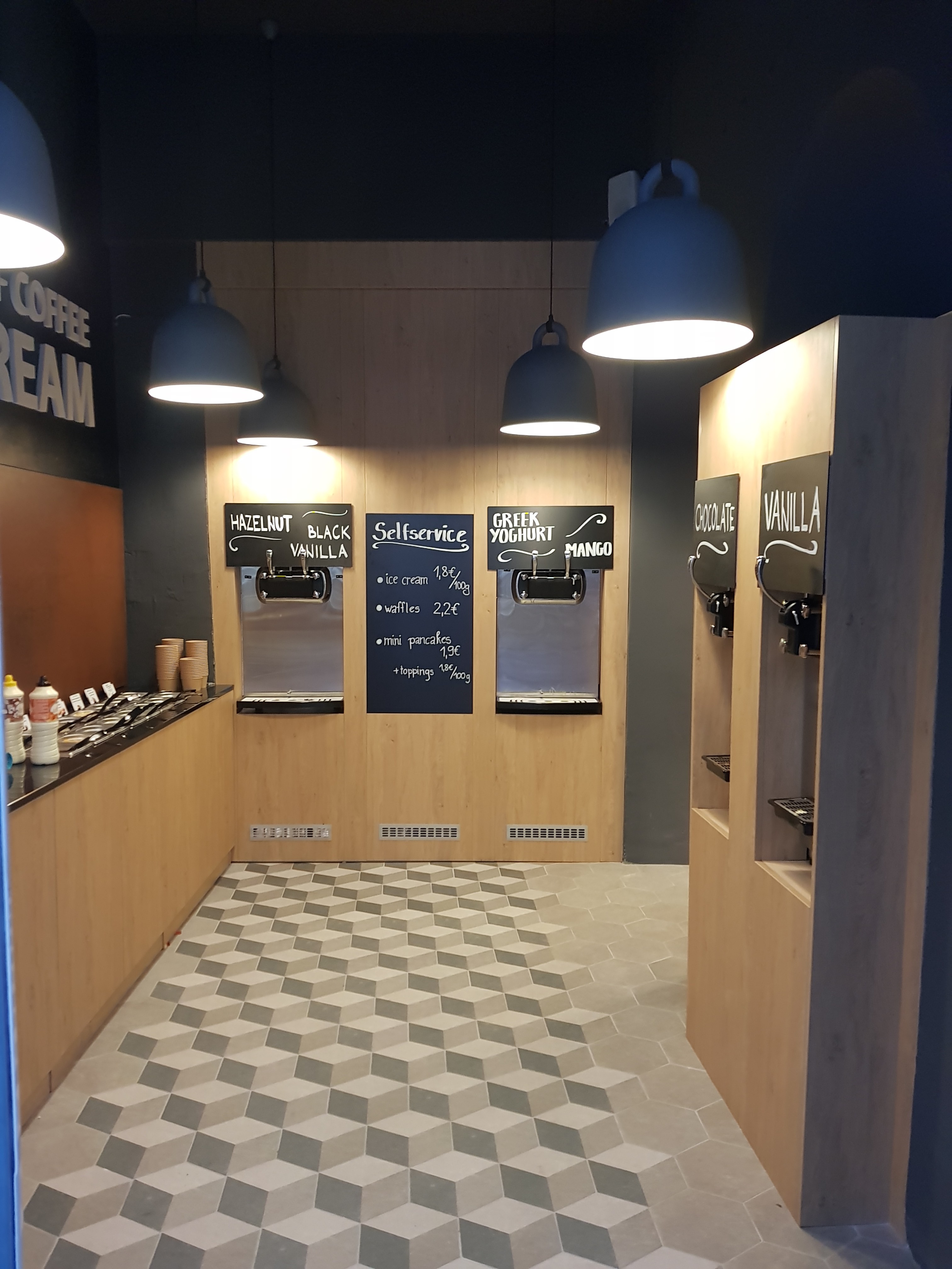 O princípio de uma sorveteria self-service permite que o cliente escolha seu próprio copo ou cone, peça waffles/mini panquecas/donuts americanos e adicionar extras opcionais, coloque na balança, pague e aproveite.