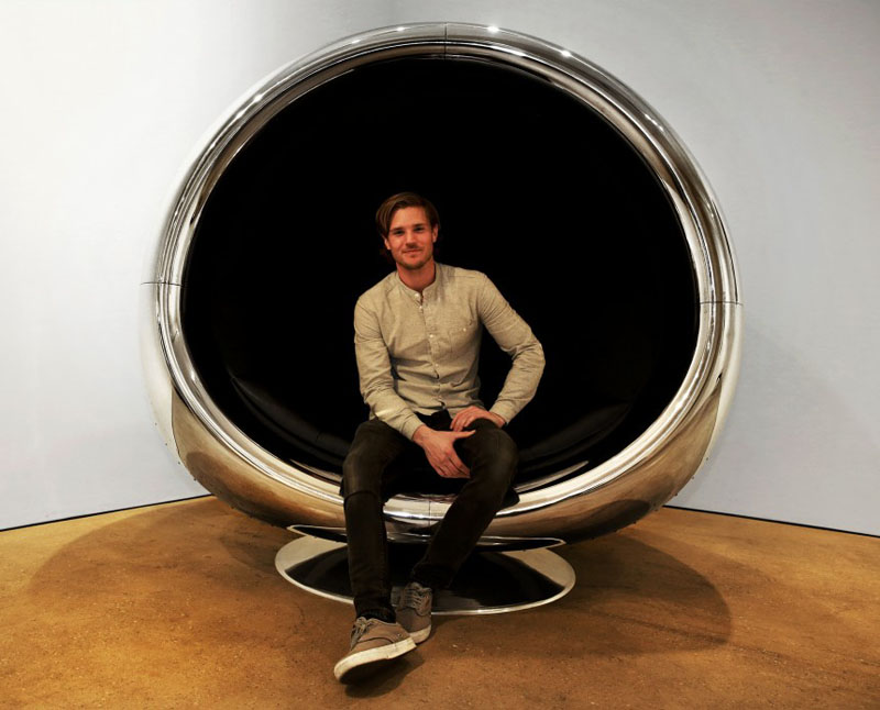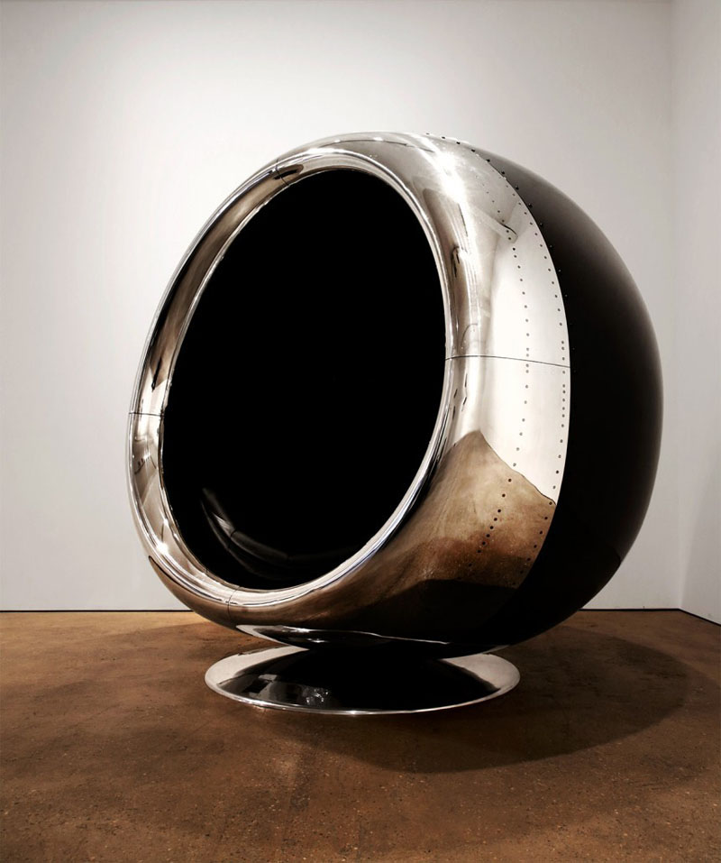 Uma cadeira feita de um motor a jato Boeing 737 é uma reformulação, não uma réplica, da tampa do motor a jato da famosa aeronave. A cadeira grande é feita de alumínio polido e estofada internamente em couro preto.