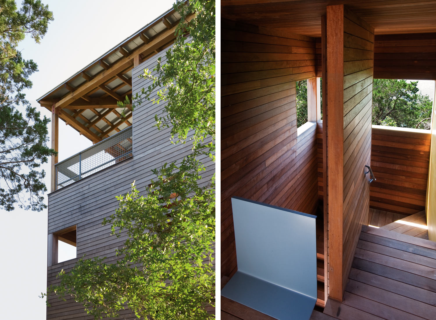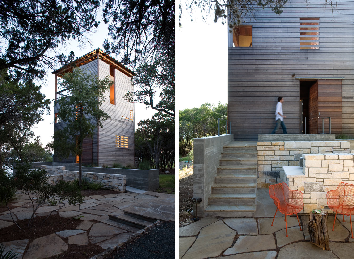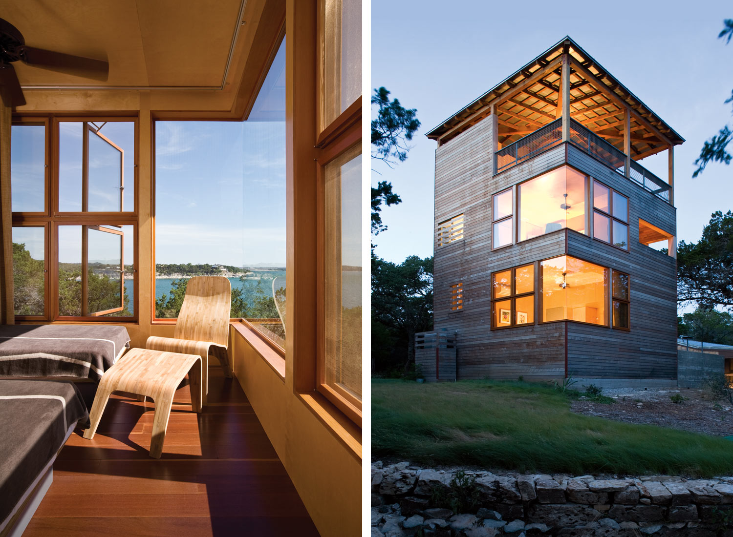 Nas margens do Lago Travis em Austin (Texas) ergue-se a idílica Tower House, projetada por Andersson-Wise Architects. A casa destaca-se fortemente das suas congéneres, por ser alta e não ter paredes de pedra mas forrada a madeira. Por causa disso, ele apenas se mistura com o ambiente. Foi construído com o objetivo de agregar um espaço de convivência a uma das cabanas mencionadas. E cresceu um prédio de três andares, cuja "fachada" de madeira complementa lindamente as pedras ao redor e apenas implora para você subir ao topo e admirar a vista do lago.