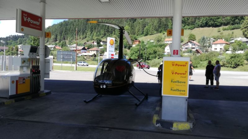 S Slovaške prihaja posnetek iznajdljivega češkega pilota helikopterja, ki mu je zmanjkovalo goriva, zato je moral poiskati najbližjo bencinsko črpalko. Ker letališča ni bilo v bližini, je s helikopterjem pristal kar na bencinski črpalki za vozila. Točneje na črpalki v slovaškem kraju Valaská, ki sicer ni opremljena za točenje goriva helikopterju, toda pilot se je znašel. Vijakarju je namestil kolesa, zložil propelerje in se zapeljal do ročke za dolivanje goriva.