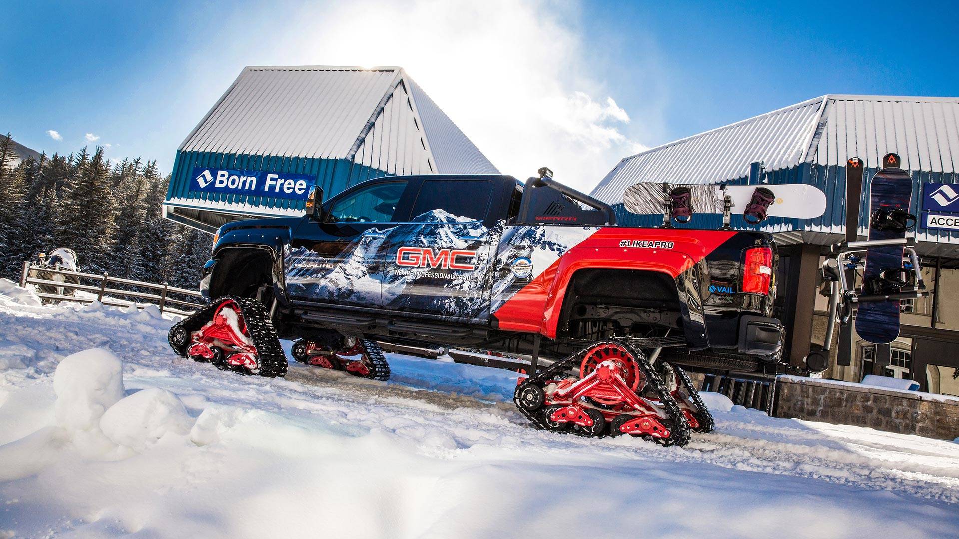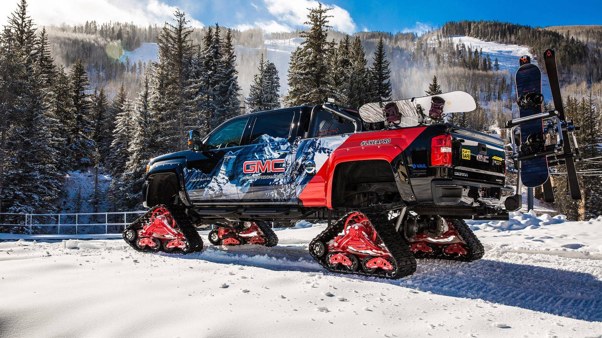 GMC tomou como base Pick-up Sierra 2500HD Denali 4WD com cabine dupla, que tem 6,6 litros turbodiesel de 8 cilindros com 455 cavalos de potência. Além de seus poderes, ele tem incríveis 1.234 Nm de torque, o que também é útil em terrenos íngremes e intransitáveis. Eles removeram as rodas e colocar faixas em vez disso Mattrack Série 150. E como se o “caminhão” não fosse suficientemente perceptível, o exterior foi revestido com um ousado tema alpino. Se mais alguém ficar preso na neve, temos o Sierra na frente guincho e para melhor visibilidade grande luz LED. Thule contribuiu com racks de snowboard que são instalados na caixa de coleta. O interior oferece conforto estofamento de couro e Sistema de som BOSE. GMC Sierra com faixas é um deleite para os olhos, mas se você quiser ver você mesmo, pode fazê-lo na área de esqui Vail.