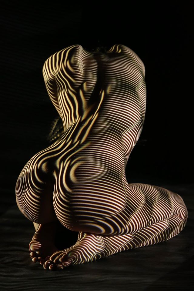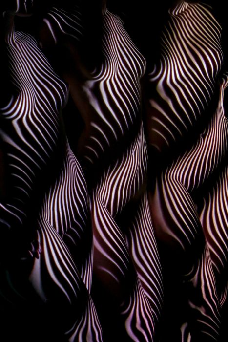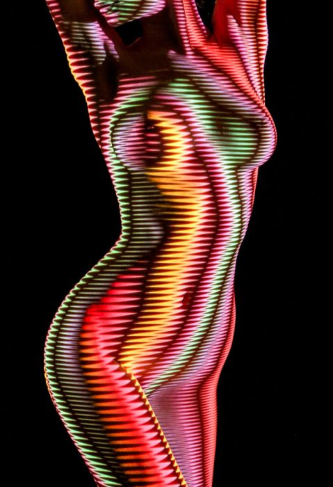 Dani Olivier é autor de retratos sedutores de mulheres, que ele veste apenas com luz. Há oito anos trabalha com projeções de cores, com as quais desenha e realça o corpo.