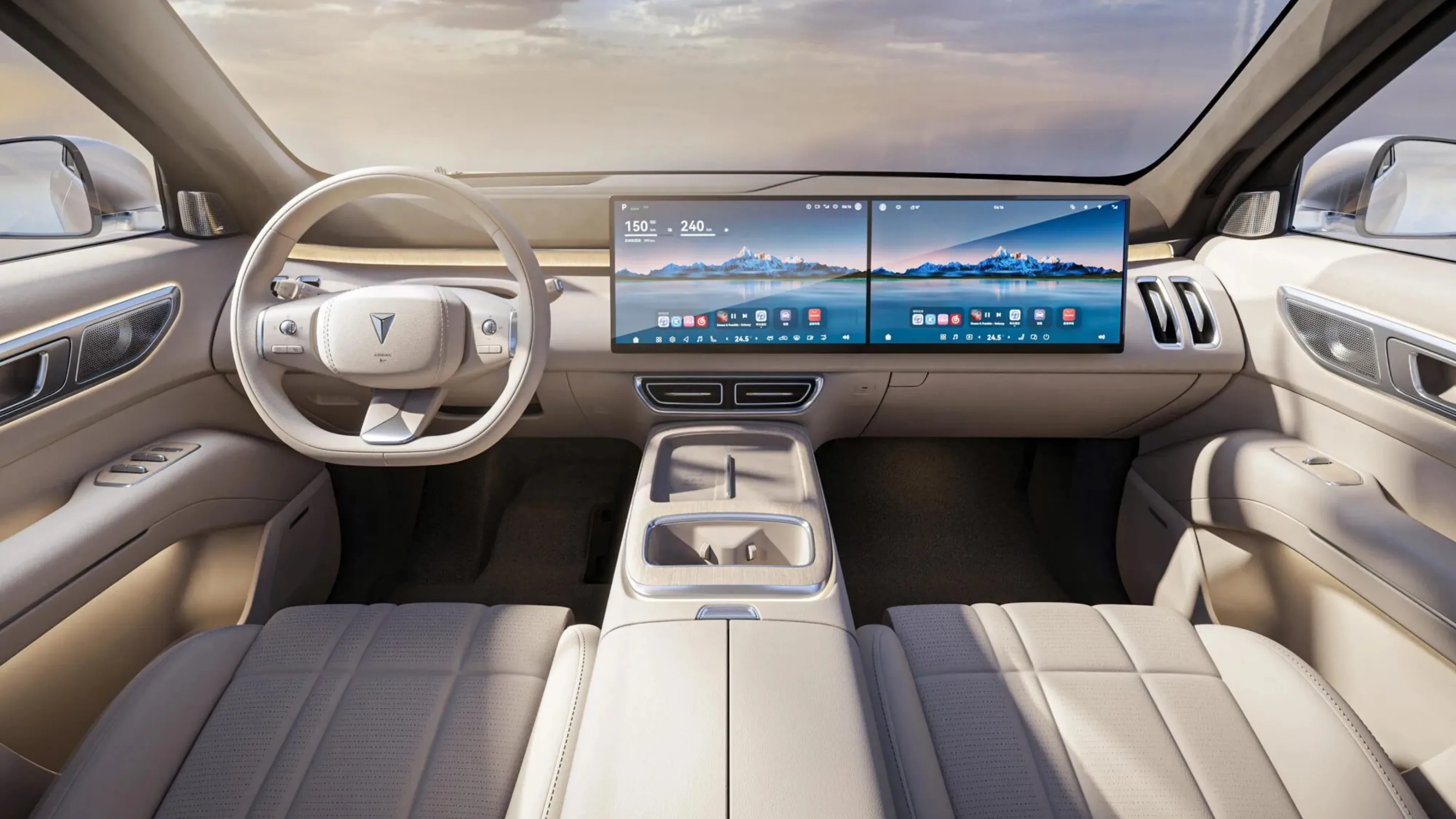 Se o exterior impressiona, o interior deixa você sem palavras. O Deepal S09 tem três telas: duas unidades OLED de 15,6 polegadas no painel e um gigantesco head-up display AR de 43 polegadas que substitui os medidores tradicionais. Os passageiros da segunda e terceira fileiras podem aproveitar uma tela de 21,3 polegadas que desce do teto, perfeita para noites de cinema no carro.