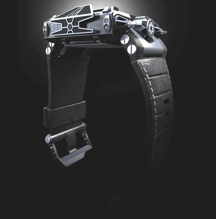 "Venha e deixe-me levá-lo para o Lado Negro." Se isso significa que poderemos levar até lá um relógio de pulso Devon Guerra nas Estrelas, então ficaremos felizes em participar Darth Vader e a empresa. O relógio pronto para uso é adornado com seu famoso capacete, asa de uma espaçonave TIE Fighter e o símbolo do Império (embaixo), e a alça imita as luvas desse famoso vilão.