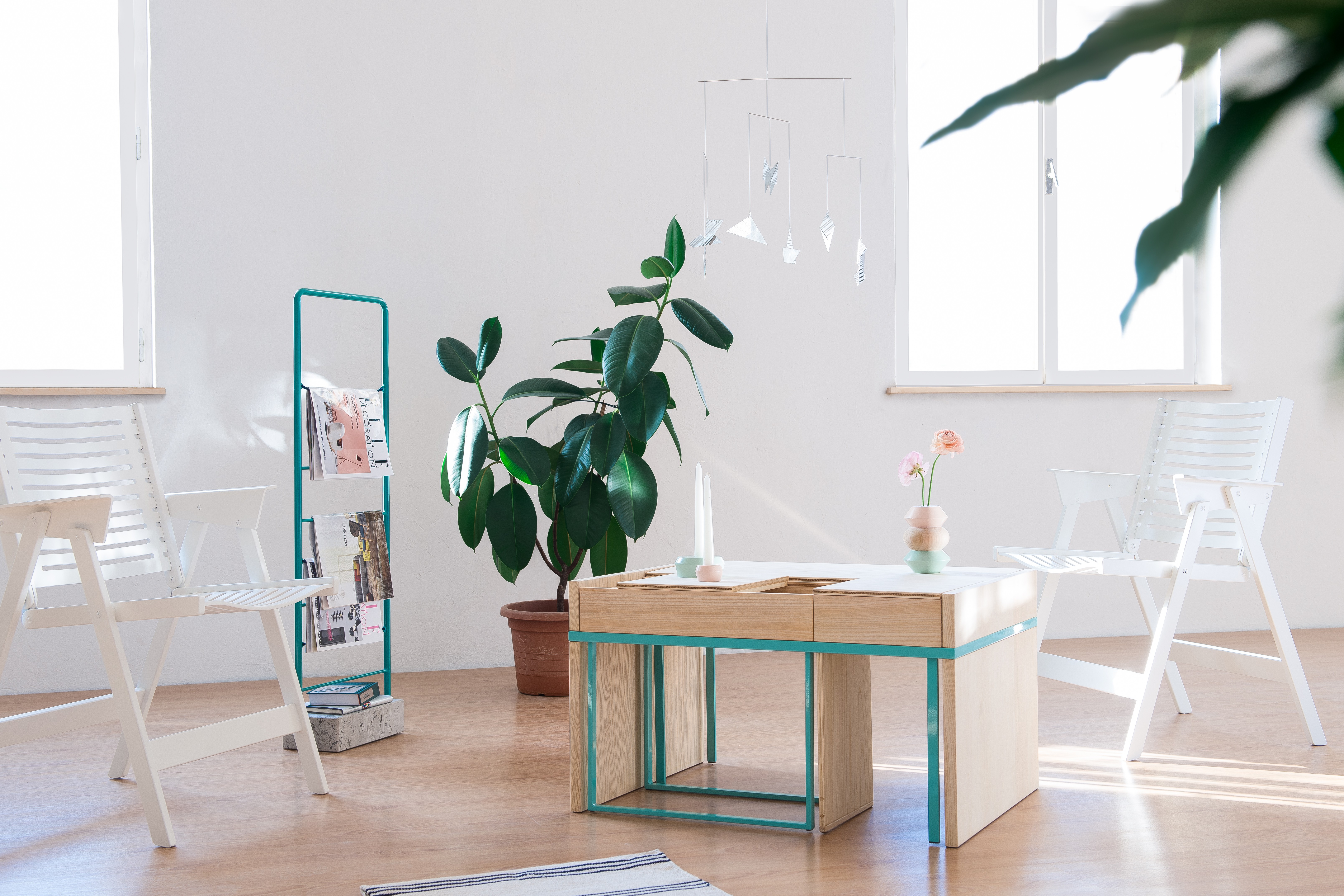 Estamos orgulhosos de todo o trabalho que fizemos até agora, pois nos esforçamos muito em cada etapa individual do processo. Além da mesa de centro Kumi, também projetamos o porta-jornais Fo e a coleção de vasos e castiçais Pina.