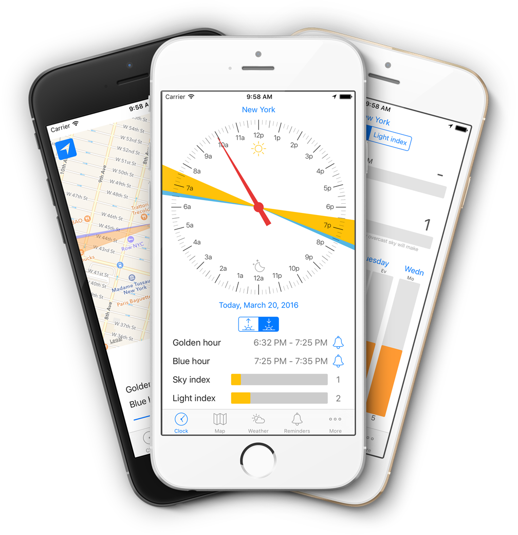Fotografska aplikacija GoldenHour.One izda vse, kar potrebujete. Lokacijo z najboljšo svetlobo, exatamente pozicijo sonca, trajanje zlate ure, in ker mora vreme sodelovati s fotografom, t. i. Skyindex in Lightindex povesta, kakšni vremenski pogoji vladajo in kako ugodno je to za različne vrste fotografij (pokrajinska, portreti …). Trenutno je na voljo zgolj za uporabnike naprav iOS.