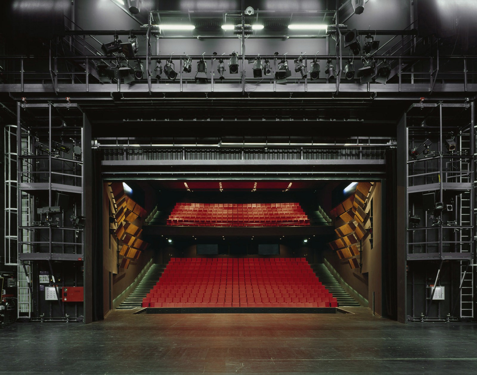 Fotógrafo Klaus Frahm Ele nos leva ao palco do teatro com sua câmera e nos mostra o teatro como os atores o veem. Na fotografia teatro na perspectiva dos atores Os papéis se invertem, portanto, com o auditório se transformando em um chuveiro semelhante a um cartão-postal, enquanto o palco assume uma dimensão espacial.