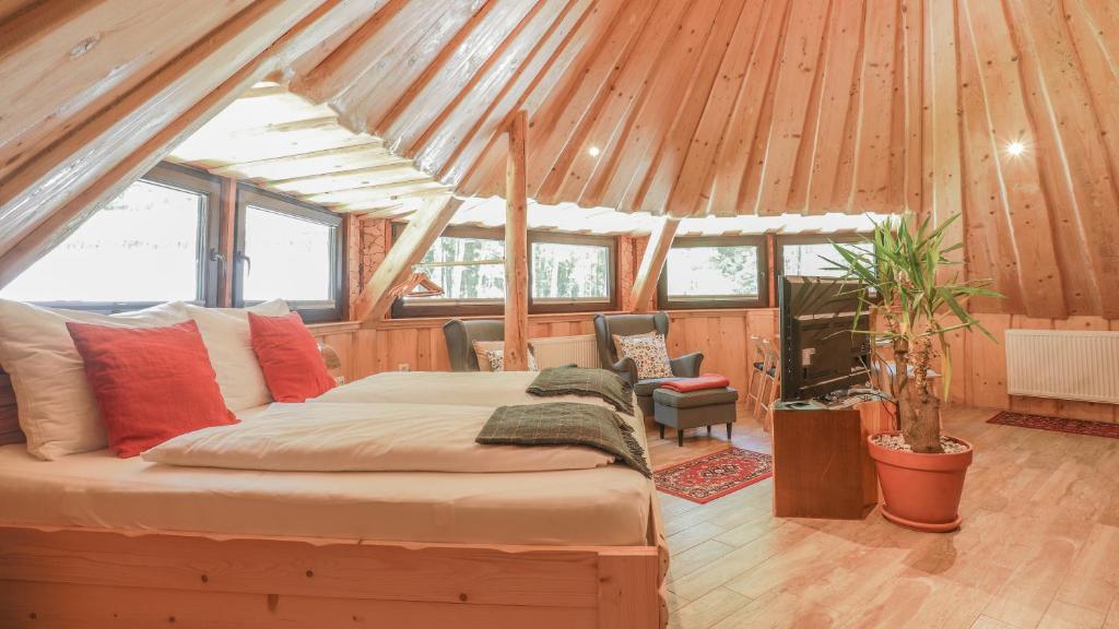 Para além do glamping, aqui também tens quartos disponíveis - quarto duplo no sótão com uma cama de luxo para um sono leve e tranquilo, quarto duplo com varanda, que é um verdadeiro ninho de amor com vista para o jardim e mata - e apartamentos: suite Verde com um quarto, terraço e vista para a mata; Suíte premium com um quarto e sala e pa Suíte Superior no tamanho de 110 metros quadrados, que combina luxo e conforto agradável.