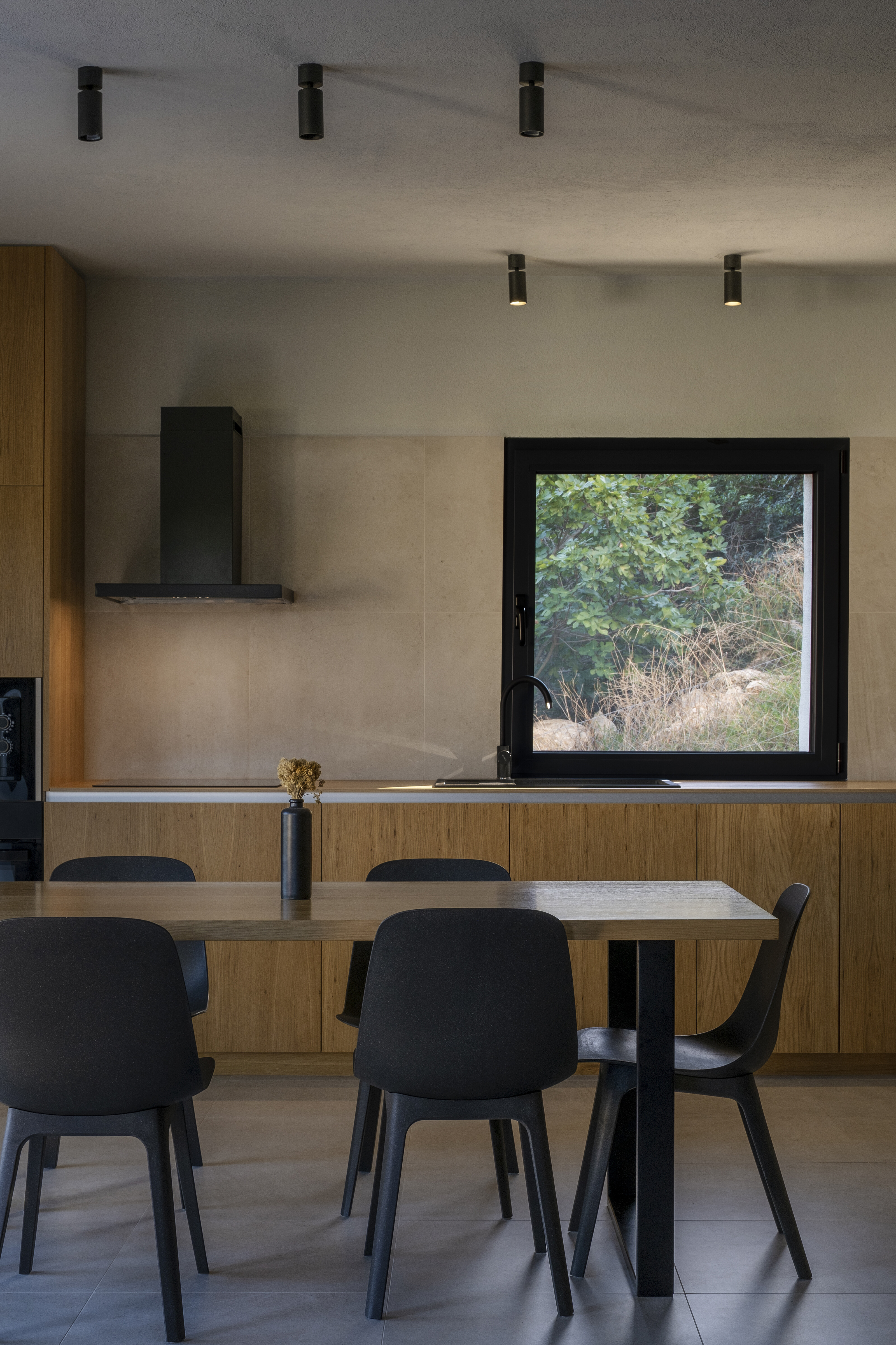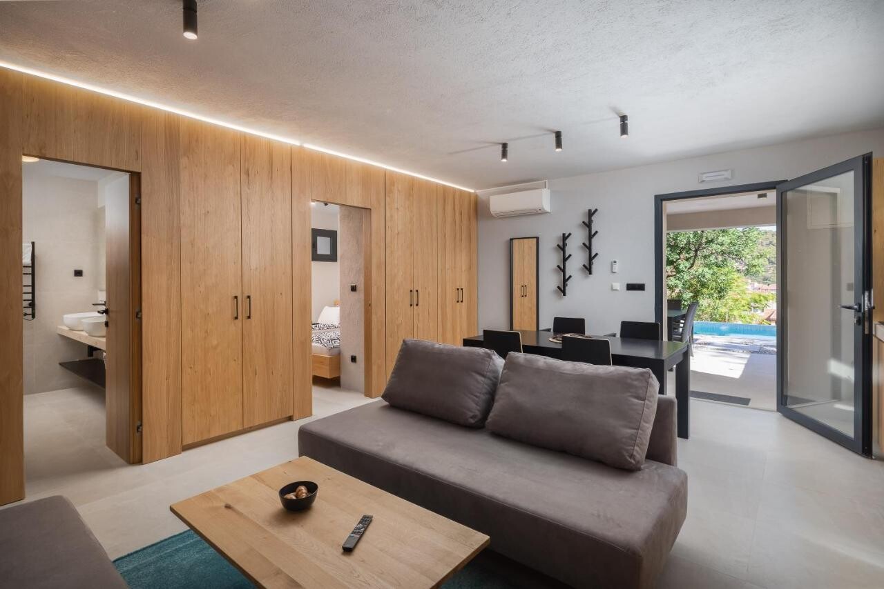 A planta baixa também foi redesenhada, oferecendo uma nova visão de comunicação com o terreno. Pela entrada principal entramos nas zonas de dormir, junto às quais existe também um grande terraço com vista para as ilhas da Dalmácia. Desça as escadas para o primeiro andar, onde existem mais dois quartos com casas de banho anexas, e um andar abaixo é a sala de estar com uma grande esplanada cantilever. Devido à posição e altura do edifício, ele é colocado na sombra durante os meses de verão, mas ao mesmo tempo oferece vistas magníficas dos arredores. No piso inferior, encontramos um espaço de convívio com garrafeira, que se abre para a cozinha de verão através do terraço.