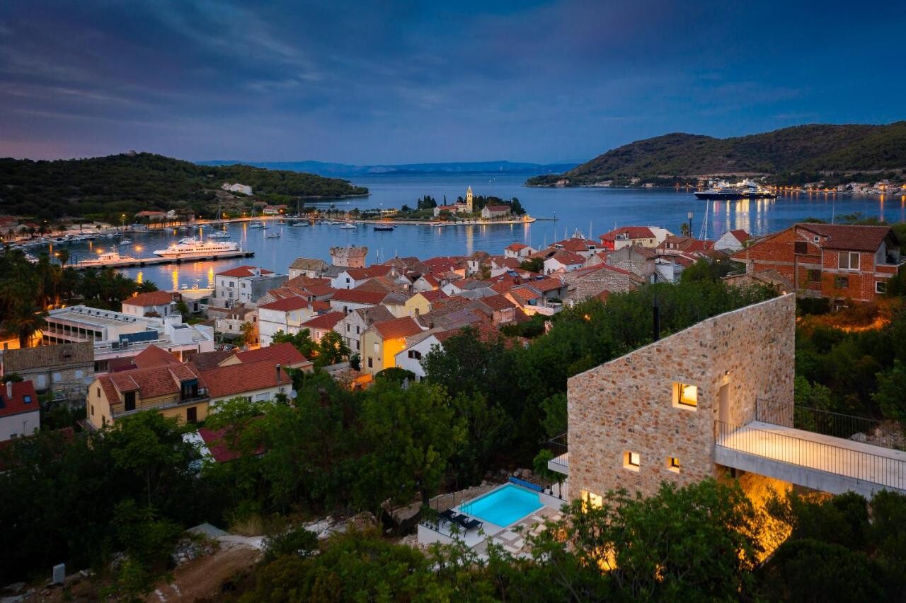 Os arquitetos do estúdio estão localizados em um terreno íngreme que se eleva acima do porto de Viš Estúdio Archaos projetou uma interessante casa de pedra moderna. Com a escolha dos materiais, homenagearam a tradição arquitetônica local, e com a própria forma responderam aos desafios do local. A interessante casa de férias distingue-se pela pedra Viški local na fachada, que está em sinergia com as lajes de concreto polido com as quais os terraços em balanço são feitos. Elas saem do prédio como pontes e conectam a casa com o mundo exterior. O acesso ao edifício para o terreno também é feito por uma ponte, que é a melhor solução de acordo com as normas de construção exigidas do local. Com os materiais selecionados, os arquitetos quiseram combinar harmoniosamente pedra arquetípica e concreto moderno e reinterpretar a imagem de uma casa de pedra tradicional.