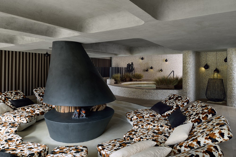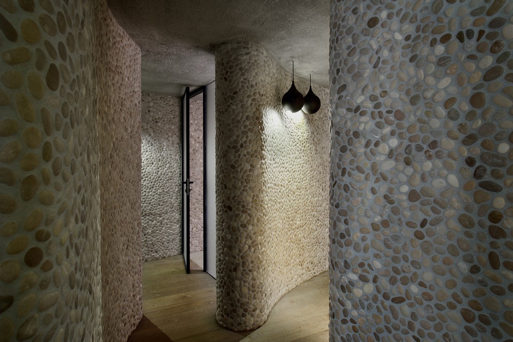 Muros de seixos dividem o terraço em três partes: uma parte com sauna, sobre área de bem-estar e em parte de entrada. A fachada entre as seções é completamente feito de vidro. Todo o hotel foi projetado com uso de materiais locais.