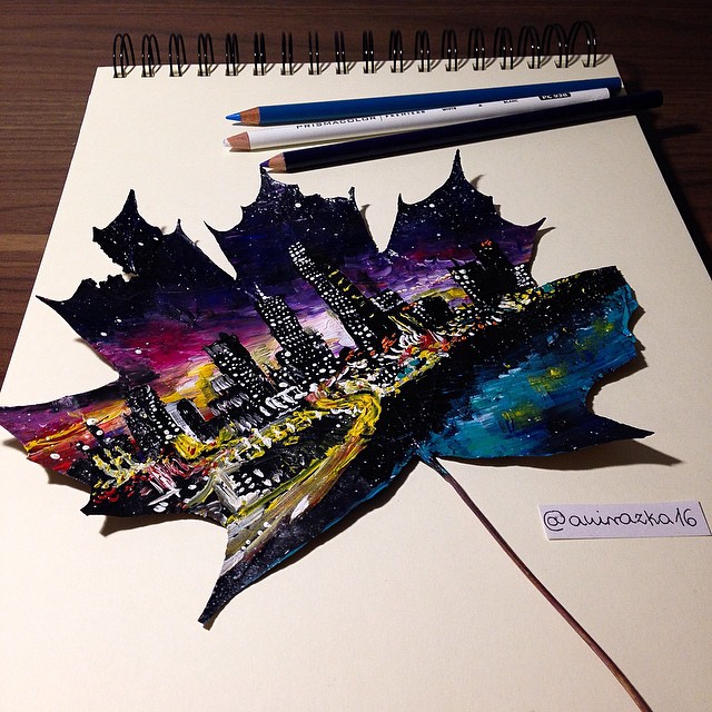 Quando as folhas começam a cair no outono, o artista polonês Joanna Wirażka certifique-se de que eles não vão para o lixo. Folhas caídas ou seja, ele usa como uma tela de pintura. Folhagem de outono, que é uma obra de arte única em si, com tintas acrílicas se transforma em belas criações que tiram dela em média três horas tempo.
