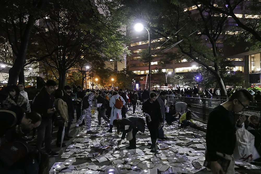 Grupo de arte anônimo Luzinterruptus é uma rua em uma cidade canadense Toronto coberto de livros.
