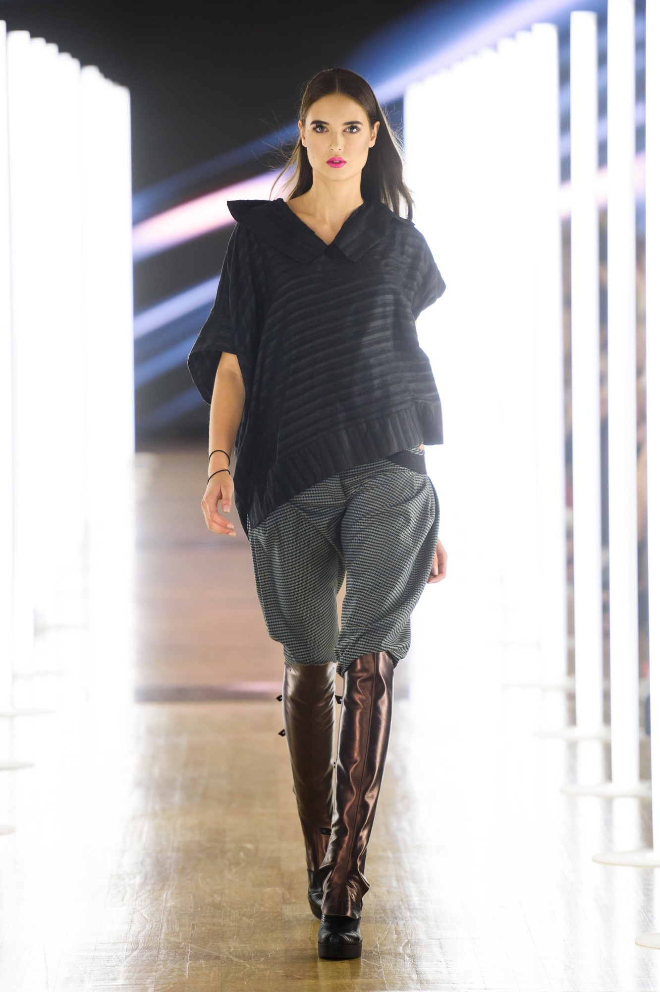 "Aisha. Mulher, vida, estar viva. A coleção Aisha destaca as mulheres africanas e suas batalhas diárias pela igualdade de gênero. O ponto de partida fundamental é a questão da identidade e posição das mulheres na África e sua resistência ao gênero masculino. A busca por significados e símbolos me levou a combinar diferentes cores, padrões e texturas, com forte ênfase nos materiais. A coleção é mais focada no design têxtil." Tina Gorkič, como aluna da Faculdade de Ciências e Tecnologia de Ljubljana, ganhou o prêmio de apresentação na semana de moda seguinte na LJFW de abril, então desta vez ela apresentou sua própria coleção.