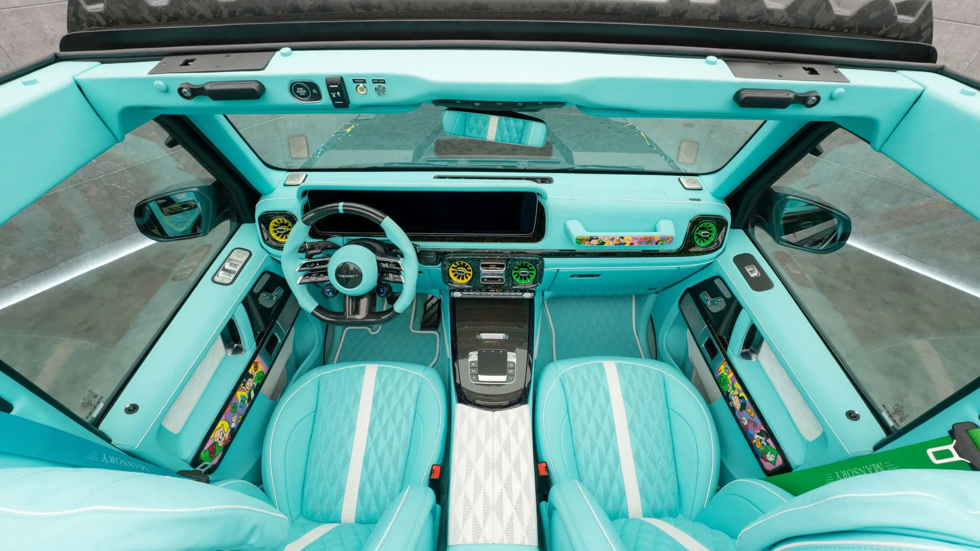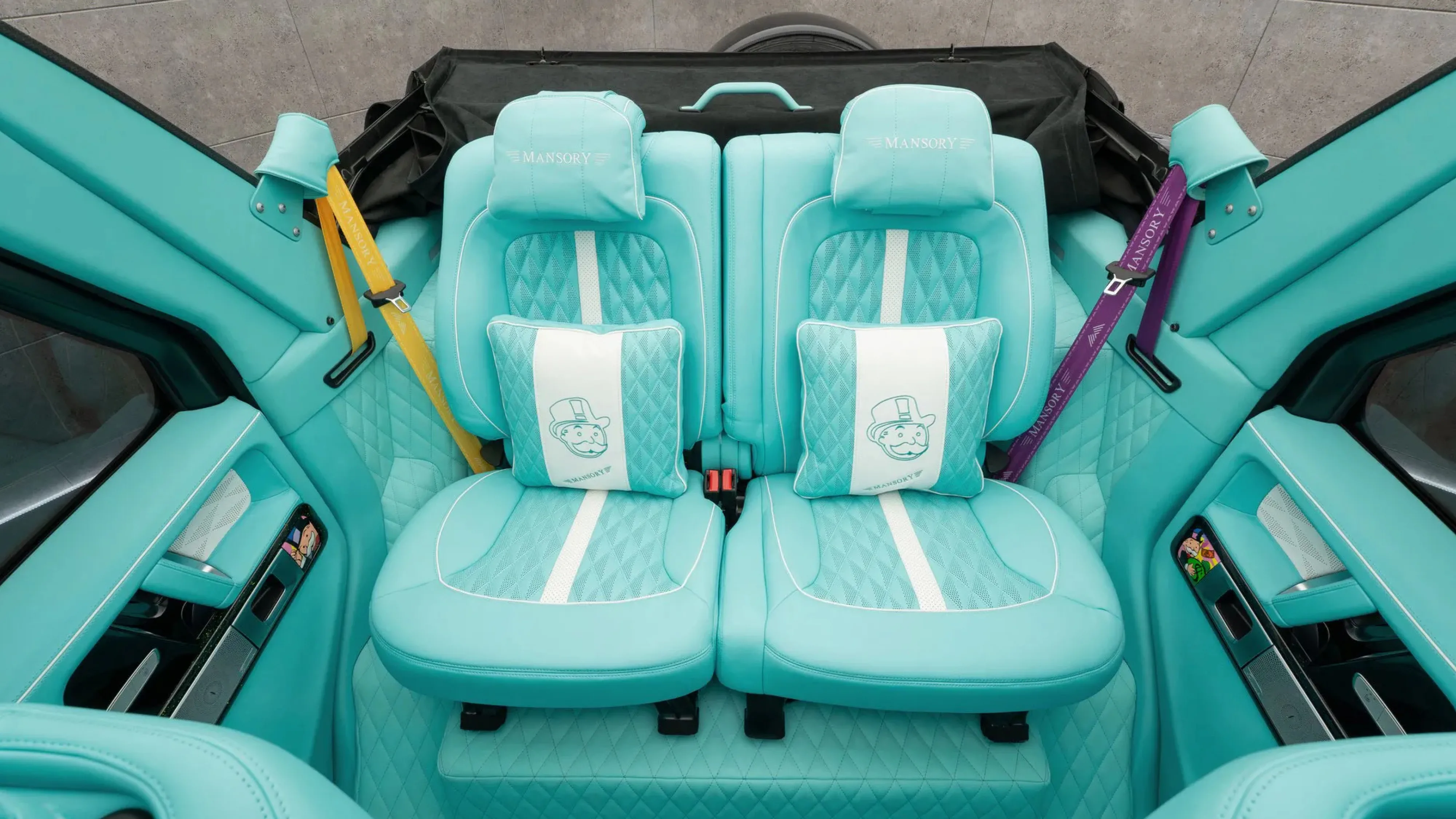 Interior AL3C MONO907Y é uma verdadeira instalação de arte interativa. Os compradores mais prestigiados podem escolher o tipo e a cor do couro, o padrão das costuras e os acessórios, mas todos os exemplares são decorados com personagens do Monopoly e símbolos de negócios financeiros. Detalhes pintados à mão podem ser encontrados nos painéis das portas, nas maçanetas do painel e até no forro do teto. Quem já comprou um Classe G com a intenção de personalizá-lo verá agora que as ideias da Mansory e do Monopoly – especialmente deste último – superaram em muito todas as expectativas.
