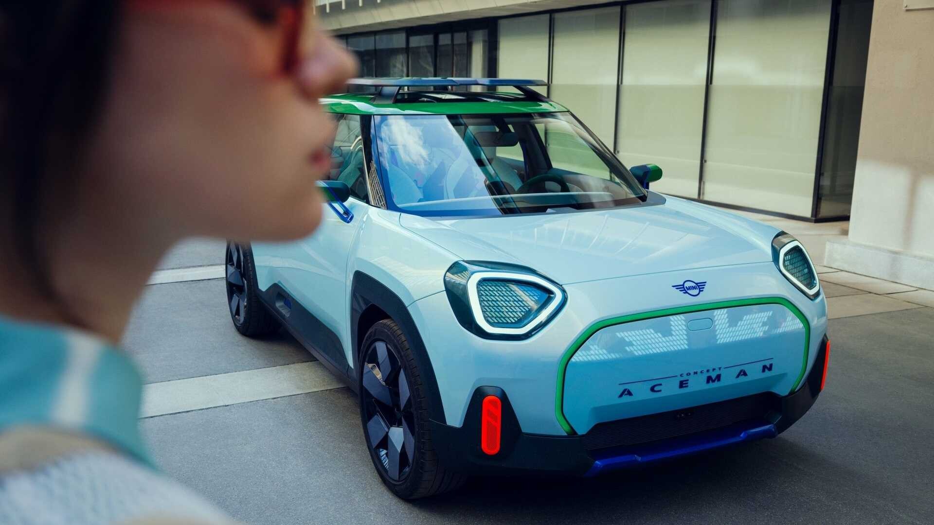 MINI Aceman é um conceito de crossover elétrico que pode ser classificado entre os modelos Cooper e Countryman em termos de tamanho. No momento, informações sobre o sistema de transmissão ainda não são conhecidas, pois o objetivo do conceito é apresentar a linguagem de design e as novas tecnologias que estarão disponíveis na marca MINI em um futuro próximo. O carro está vestido com a cor moderna Icy Sunglow Green, enquanto o teto é pintado no tradicional British Racing Green.