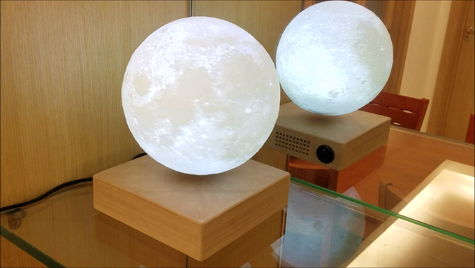 Eles permitem flutuar ímãs de neodímio, e a circulação imita órbita da lua. O usuário pode escolher entre amarelo quente e luz branca. Está disponível em dois tamanhos. 120 deve ser deduzido para o menor e 120 para o maior 170 euros. Nós carregamos sem fio.