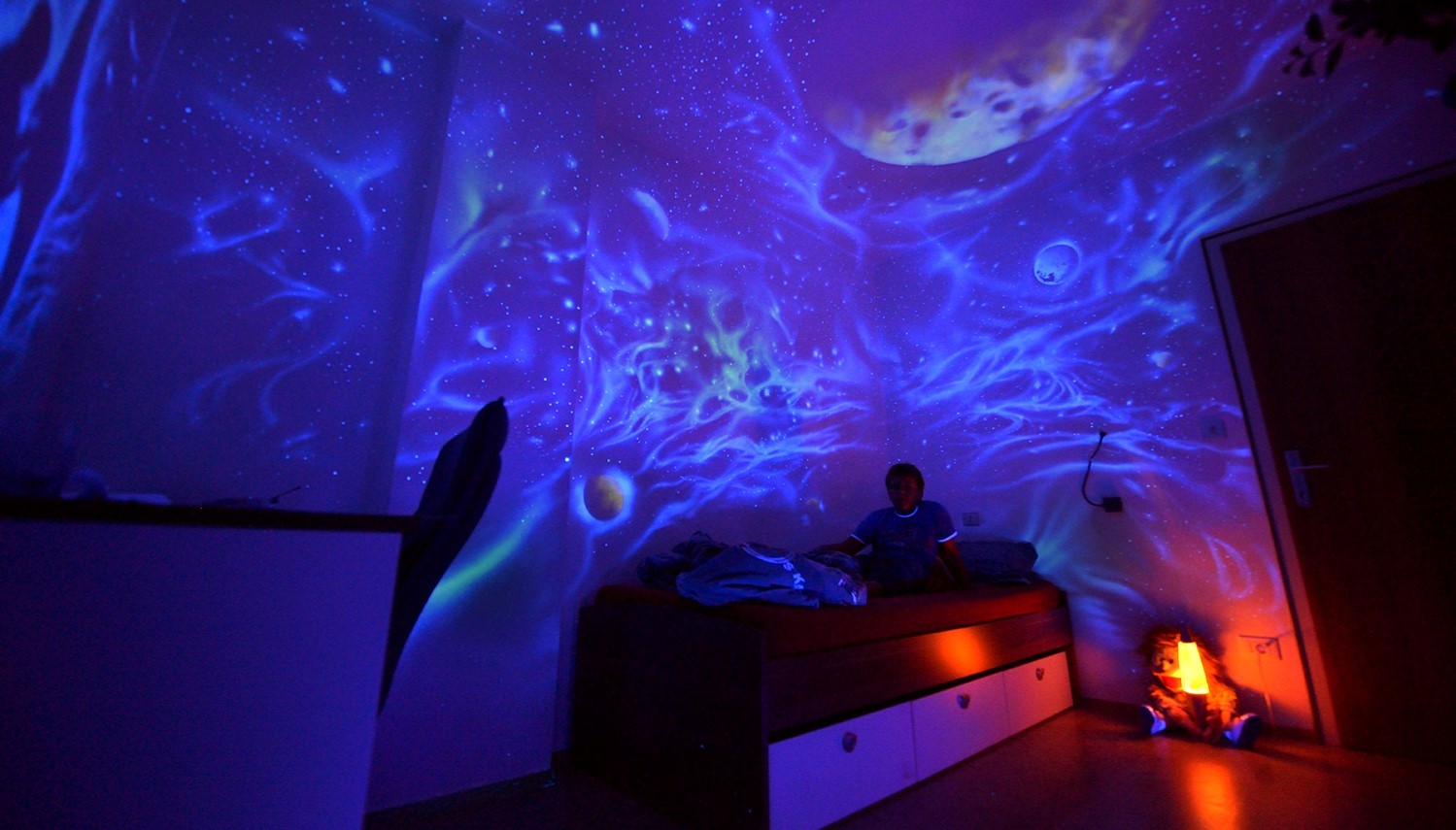 Multiluminosos são papéis de parede que brilham no escuro e estampas de parede que parecem diferentes em diferentes condições de iluminação. Com eles, você pode transformar a sala em uma terra mágica ou evocar um céu estrelado atrás das quatro paredes.