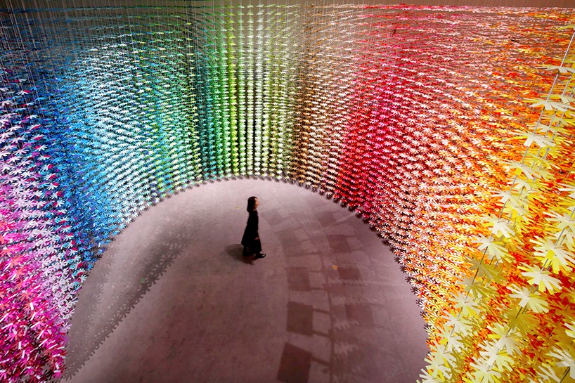 Mais de 25 mil flores de papel coloridas adornam o átrio de 6 metros de altura de um shopping em Omotesando, Tóquio. A cena visualmente deslumbrante faz parte da mais recente instalação da francesa Emmanuelle Moureaux, que criou esta obra vibrante como parte da exposição Setting the Future in Motion.