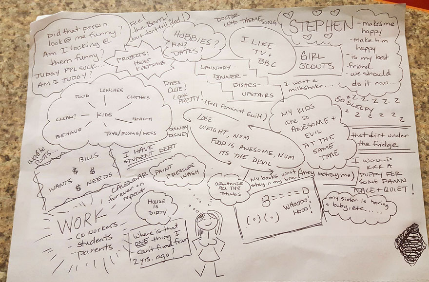 Um marido genial sugeriu à esposa que ela escrevesse e desenhasse o que está pensando no momento. Com isso, a esposa mostrou que não é estranha à multitarefa e que dá prioridade aos filhos e ao marido na vida, mas às vezes está pronta para se esquecer de si mesma. A deve ver para os homens!