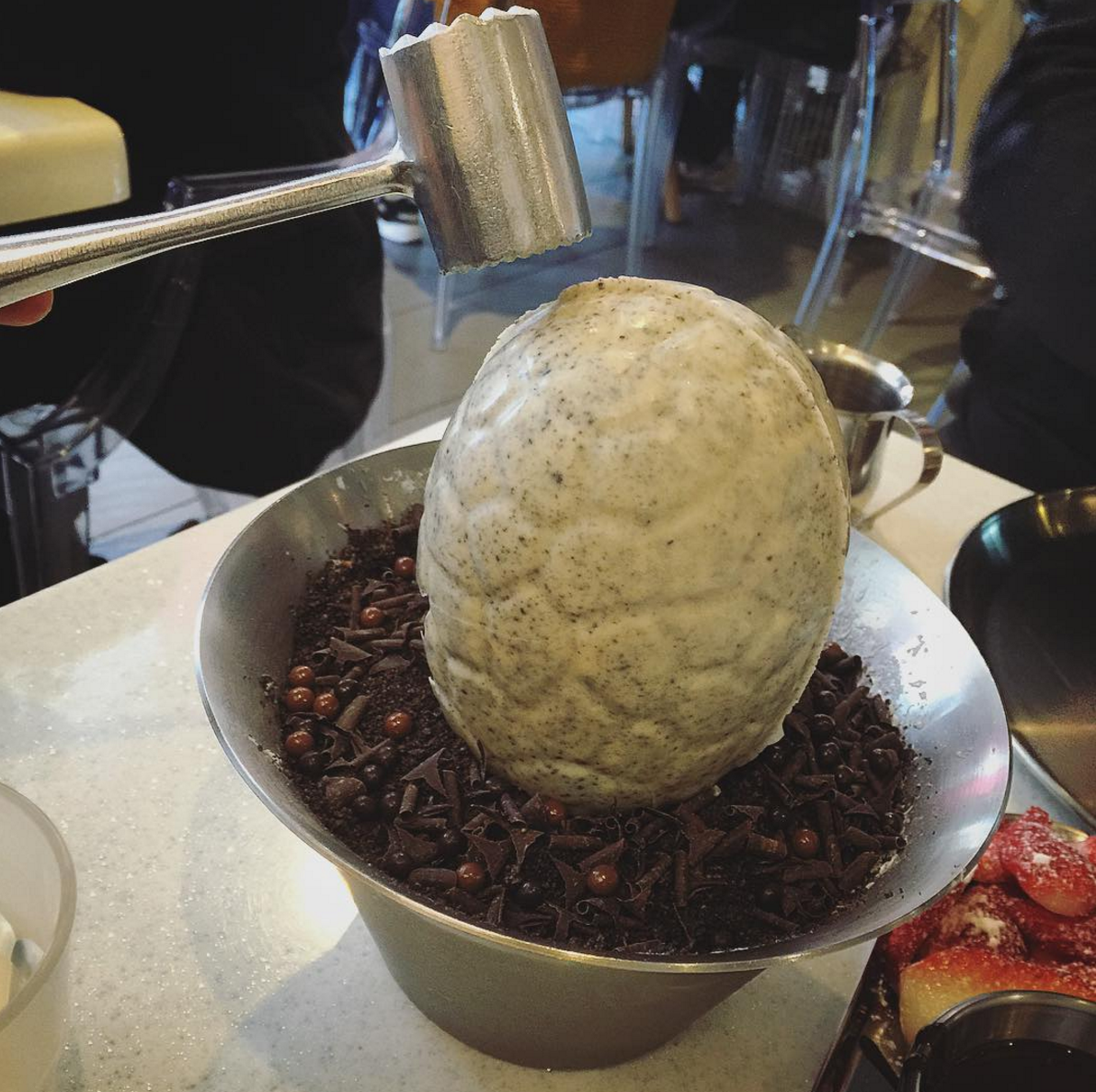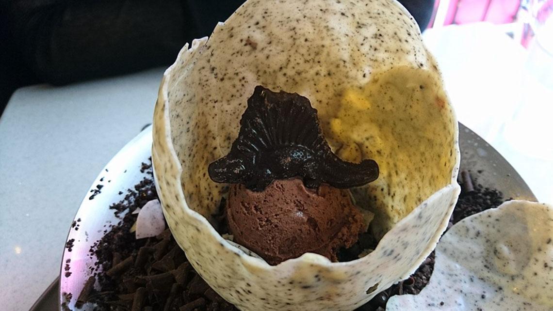 … um dinossauro de chocolate, o que você achou! Atraente ovo de dinossauro de chocolate servido em um café sul-coreano Ela deu 100%-Chocolate em Busan. Para conseguir a surpresa (um dinossauro de chocolate em pé em uma bola de sorvete), você deve: a) com um martelo de prata bata no ovo de chocolate e quebre-o ou b) despeje sobre a casca chocolate quente e deixe derreter o suficiente para chegar ao interior.