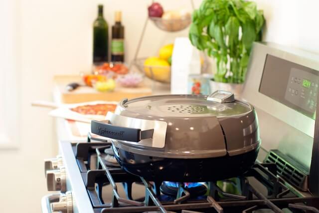 Pizzeria Pronto permite preparar pizza 30 centímetros de diâmetro. O preparo é garantido por duas pedras cerâmicas multicamadas e ventilação adequada, que retira a umidade e o vapor, para que a pizza fique no final devidamente crocante e não borracha. Assim que o recipiente atingir a temperatura certa, basta inserir a pizza na abertura, fechar a porta por três minutos e três minutos depois gire 180 graus, deixe no fogo por mais três minutos e a pizza está pronta. Louco, certo?