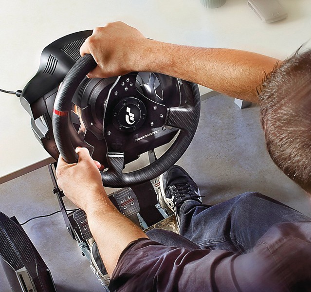 Vsi, ki smo se naveličali plastičnih pedal pri računalniških volanih ter prav takšnega občutka pri simulaciji vožnje, lahko vrtimo oči v smeri volana Thrustmaster T500 RS. Kovinska pedala, ki jih lahko namestimo na dva načina – po vzoru dirkalnika F1 ali serije GT ‒ lahko dodatno nastavimo tako po višini kakor razmaku med njimi. Seveda ne smemo pozabiti na bistven del sestava – volan. S premerom 30 centimetrov je karseda blizu avtentični velikosti dirkalnega volana. Obvolanske prestavne ročice so pritrjene na sredinsko konzolo volana, tako da se ne premikajo hkrati z vrtenjem volana. Seveda ne manjka niti t.i. Force Feedback, ki ga ″poganja″ motor s 150 Nm navora. S skupno težo skoraj 12 kg, nam zagotavlja stabilno lego tako na tleh (pedala) kot na mizi (volan). Kljub zgolj začetni podpori le konzoli PS3 in igri Gran Turismo 5 (v teku že nadgradnja podpore tako za vse naslove založnikov Codemasters in EA kakor tudi za ostale igralne platforme) širše zanimanje ne bi smelo izostati.