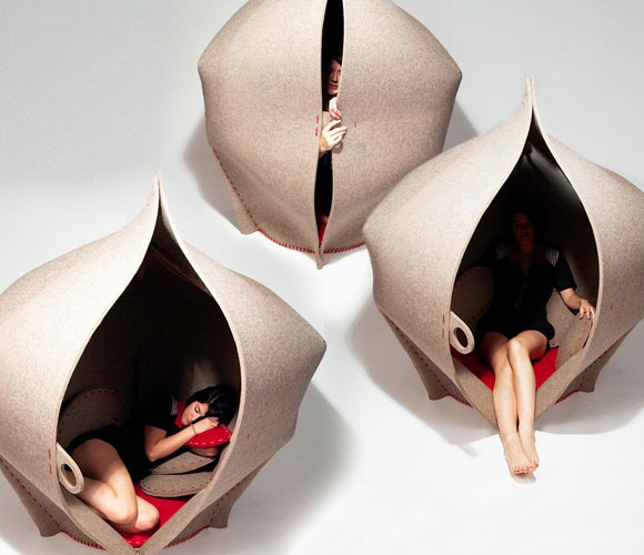 A designer britânica Freyja Sewell utilizou um casulo de feltro para criar um espaço íntimo e fechado que pode servir como um refúgio luxuoso para a solidão, um canto de trabalho, uma área de descanso tranquila ou um oásis de paz no meio de um espaço público movimentado.