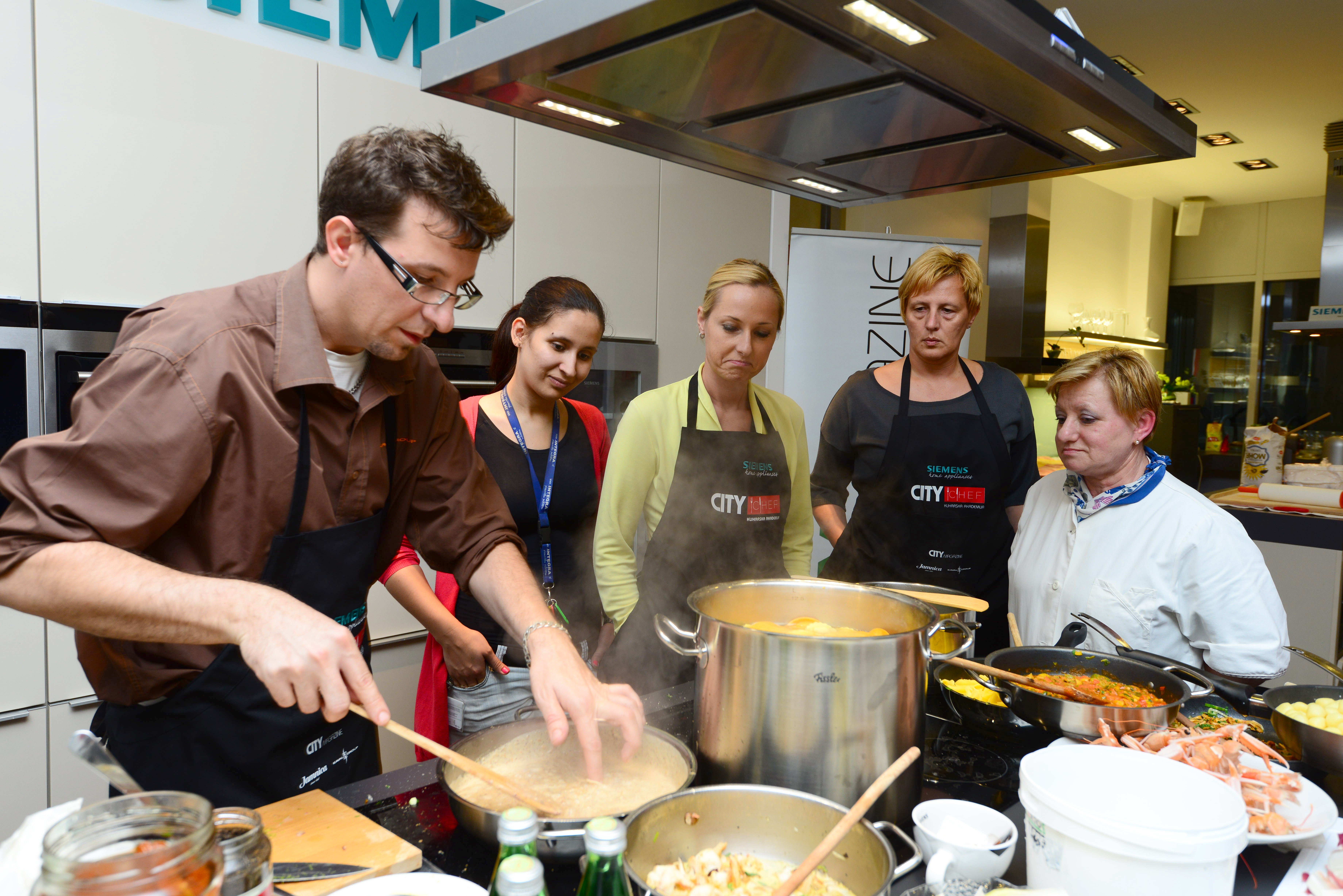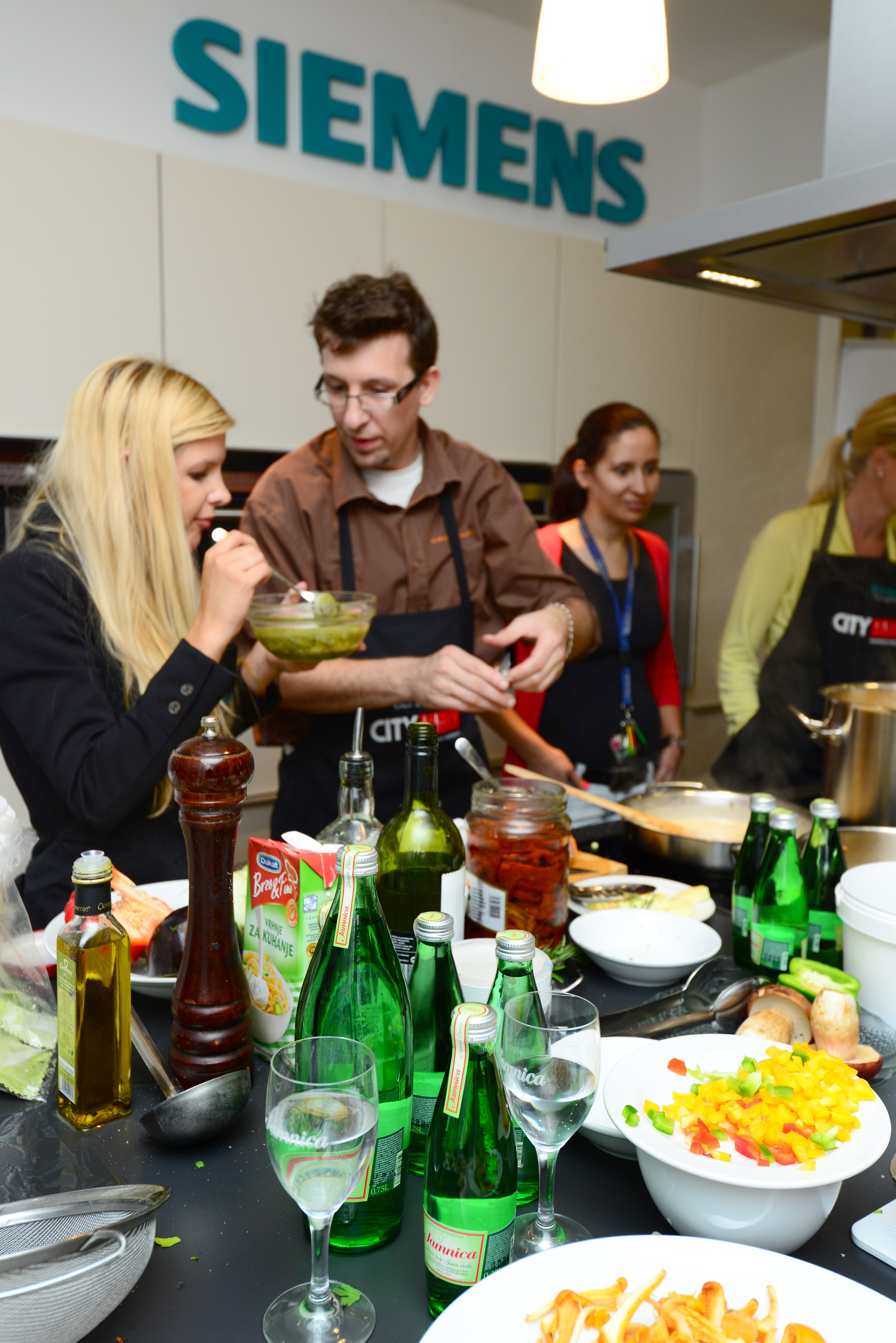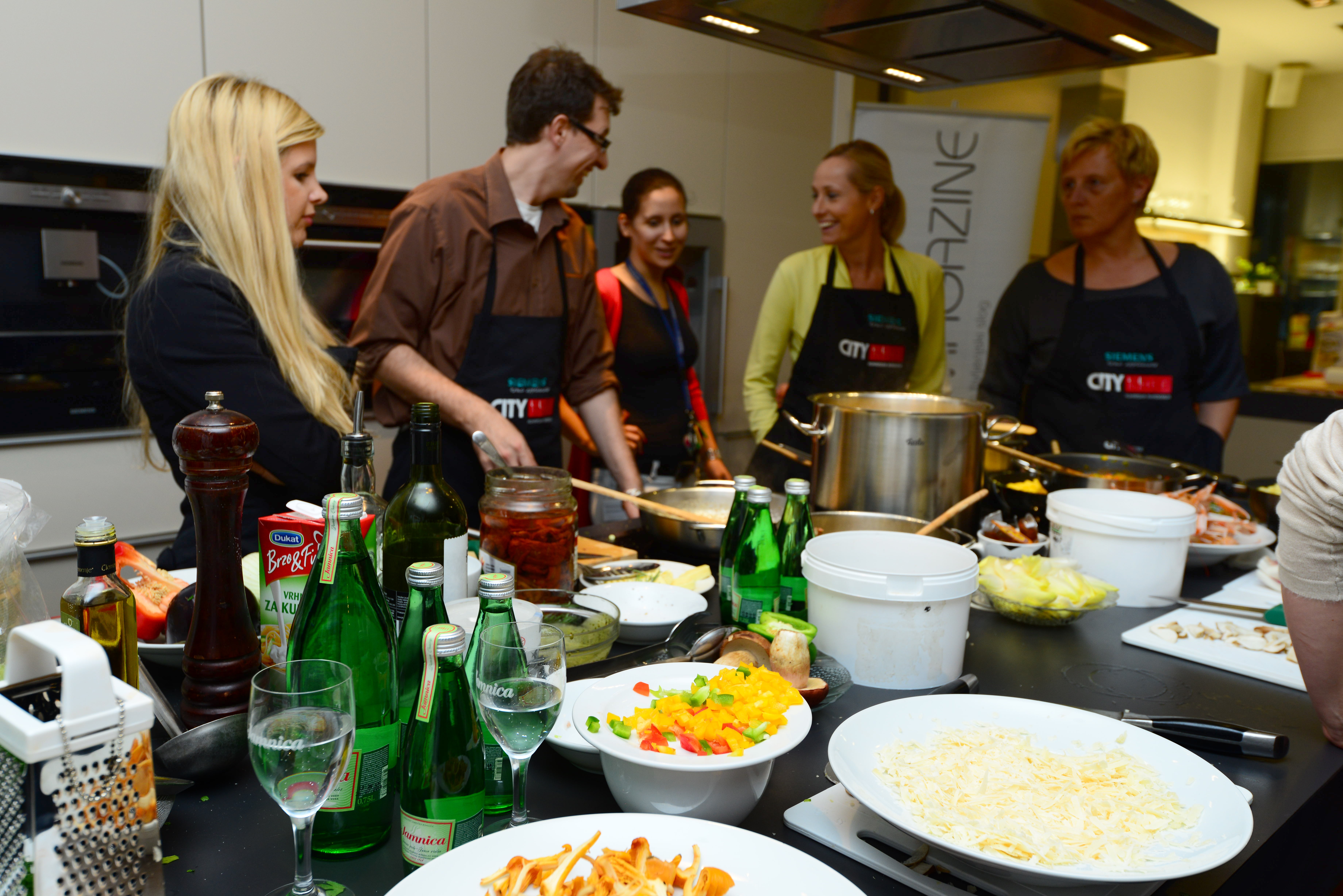 Nesta academia de culinária, estamos juntos com Dragan e Jožica de Grupo Kaval Preparamos macarrão largo, ravióli, nhoque... da maneira tradicional, com vários molhos feitos de tomate seco e abobrinha, camarão, avelãs e cogumelos porcini... Claro, uma boa taça de vinho também estava incluída na refeição. A água oficial do evento foi Poço.