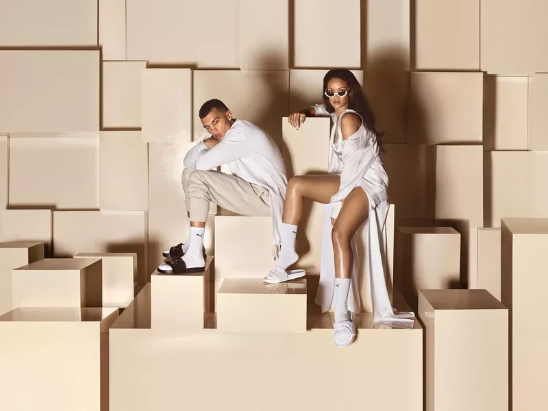 Tudo que Rihanna Seus toques se transformam em ouro. Dela sandálias de dedo Chinelo de pele Puma da Fenty Eles causaram verdadeira euforia e foram vendido mais rápido que os ingressos para o show dela (o preço também era semelhante – 80 dólares americanos), embora em uma das fotos promocionais ela tenha quebrado uma regra rígida de moda; ela combinou meias brancas e pantufas!