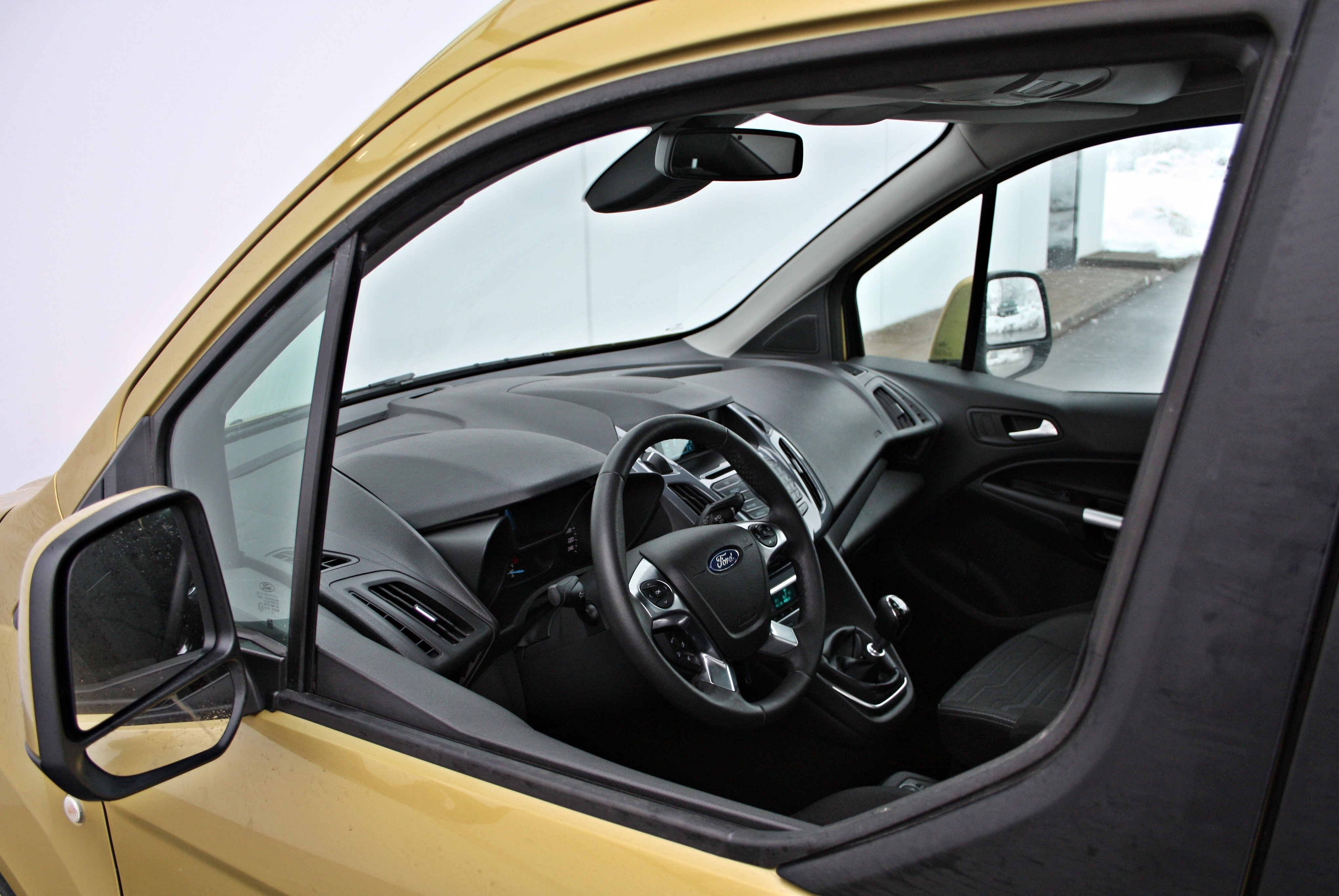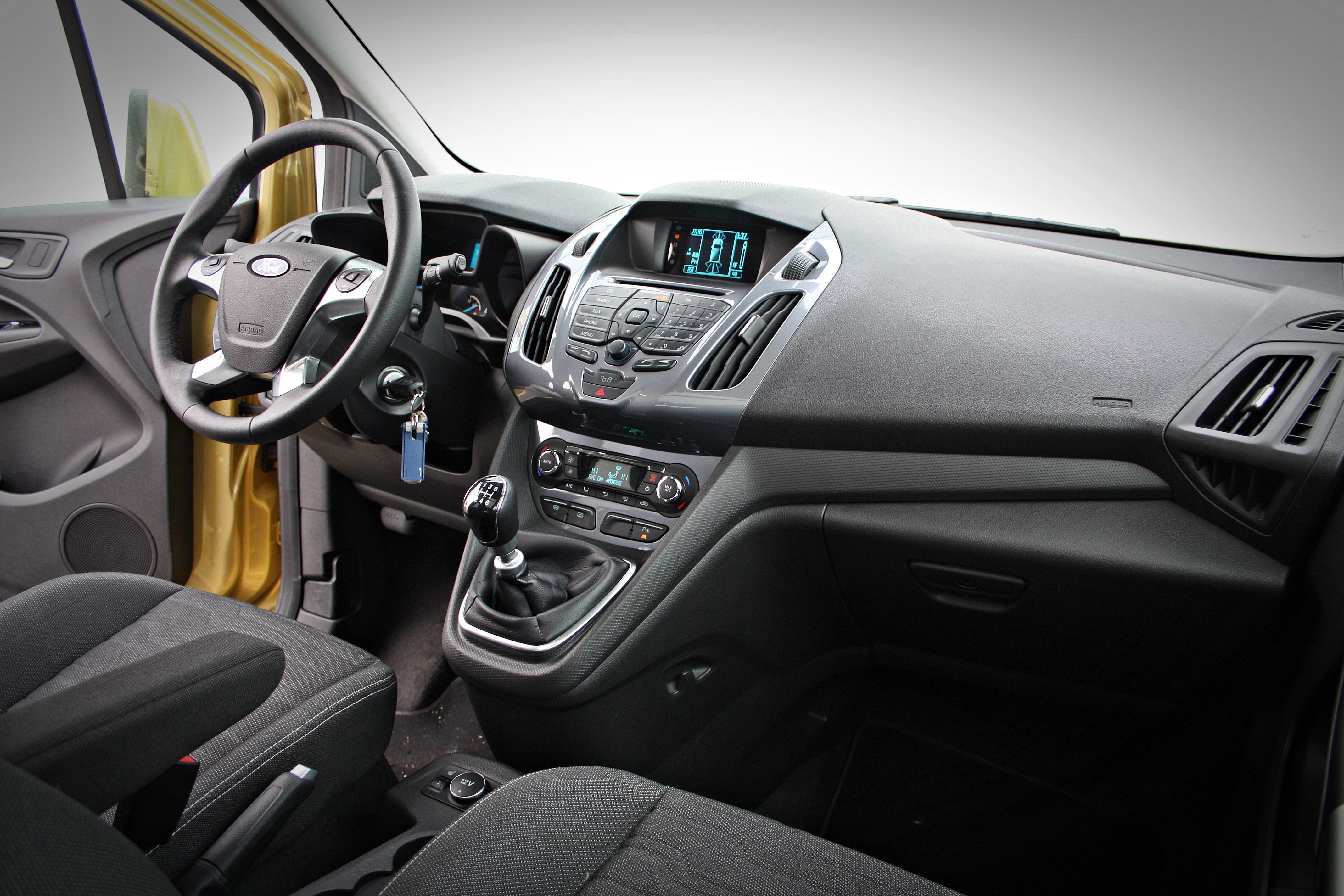 Potniška kabina tako kot izgled prednjega dela ali nosu izkazuje značilno fordovo poslanstvo, kar pomeni značilno oblikovan volanski obroč, ki lepo sede v roke, malce premonotono oblikovane merilnike ter sredinsko konzolo s prepogosto posejanimi stikali, predvsem v predelu avdio naprave. Novi focus je sicer že prestal shujševalno kuro, kar se tega tiče, kar pomeni, da je stikal občutno manj, tourneo connect bo v tem pogledu očitno moral počakati na prenovo. Tako bo osebam, ki so pred kratkim imeli ali se vozili s kakšnim novodobnim fordovim modelom, vse dodobra znano, s stališča ergonomije (ki je dobra) pa vse le ni v najlepšem redu. Tela pod vetrobranskim steklom, na katerem se izpisuje večino informacij vseh sistemov je relativno majhen, kroga za odpiranje osrednji zračnikov pa groteskno velika.