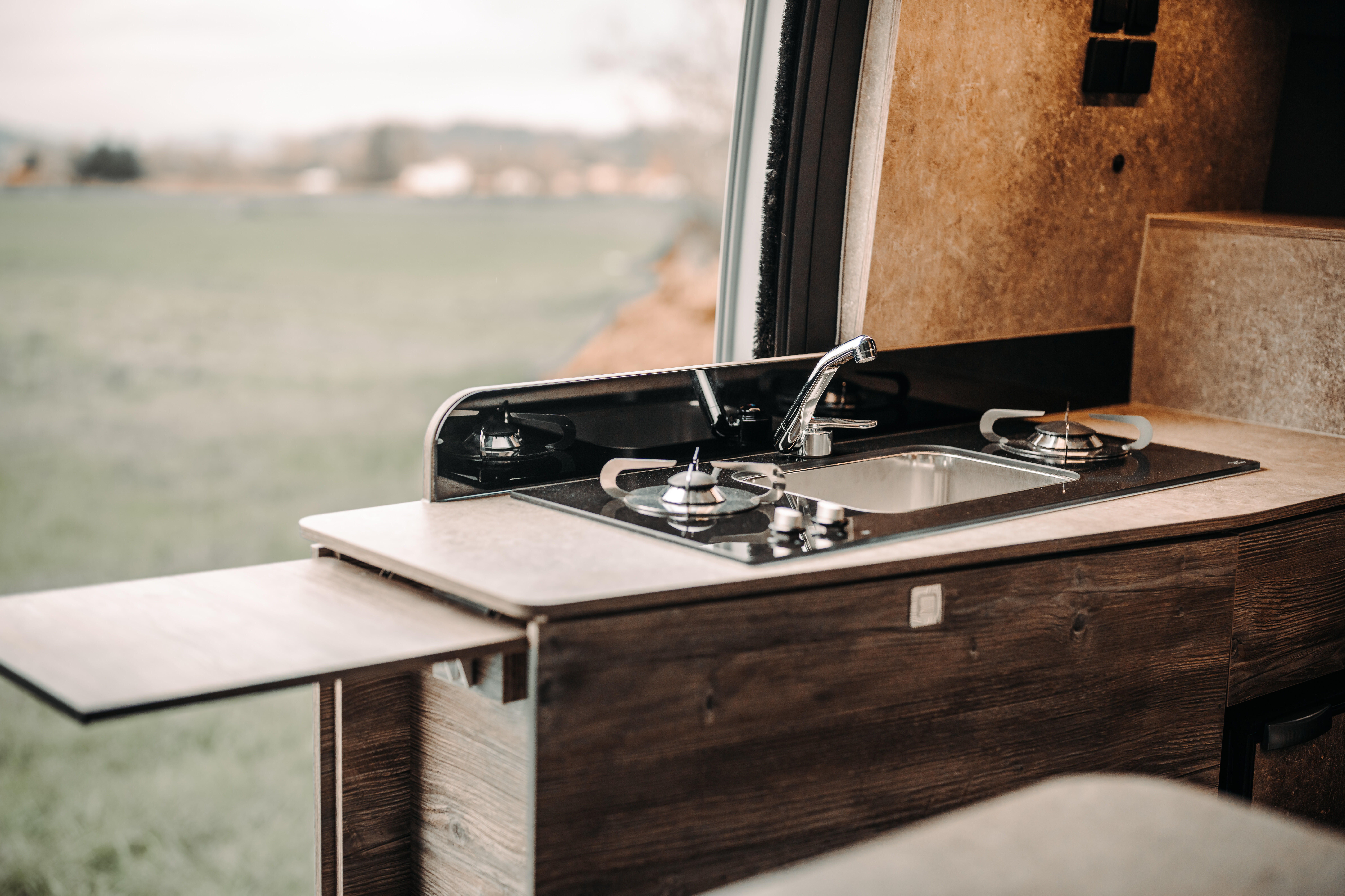 Campervan Hélios claro, também estava equipado com uma interessante disposição de cozinha, onde à noite podíamos até preparar a paella espanhola numa “panela” maior. Isto significa que os dois fogões estão separados por uma pia, o que também permite a colocação pratos um pouco maiores no fogão como sempre. Em princípio, elogio esta solução, desde que você utilize a cozinha para algo mais do que apenas fazer o café da manhã. Claro, há também uma geladeira agradavelmente escondida que oferece 90 litros de espaço e nos estragou com profundidade. A superfície da cozinha é grande o suficiente para organizar tudo corretamente. Mas existe até algum balcão para preparação de henna.