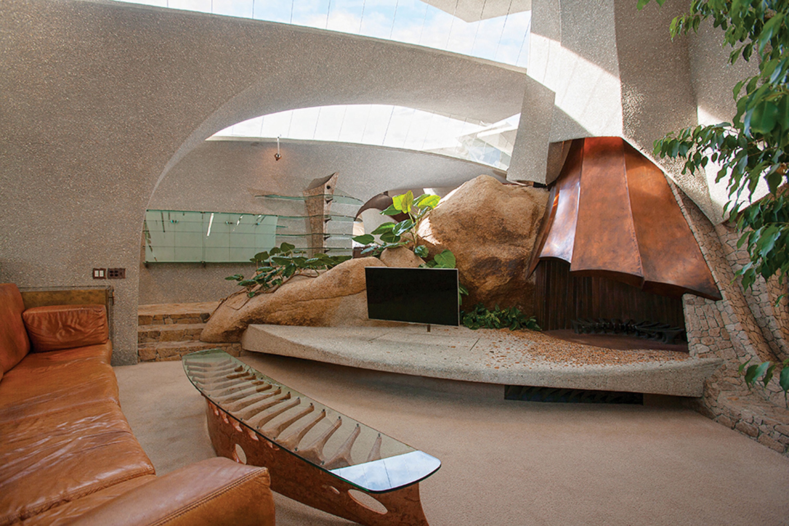 Em volta 432 kvadratnih metrov velika hiša iz betona, jekla, stekla in bakra je zgrajena na živi granitni skali. Zunanjost poslopja spominja na ogromnega členonožca do vesoljskega plovila, odvisno kje stojimo. Notranjost pa poseže še po bolj radikalnih idejah. Naravno bogata svetloba se zlije s skalami in neverjetno notranjo opremo, ki jo je oblikoval John Vugrin.