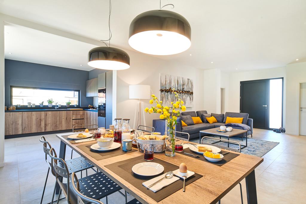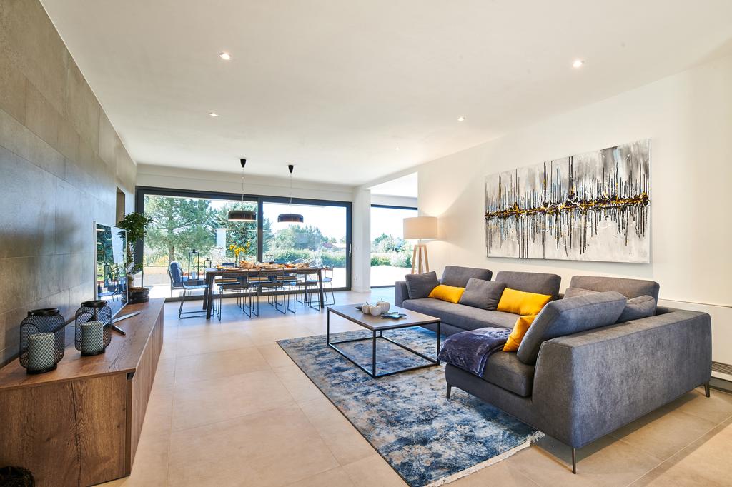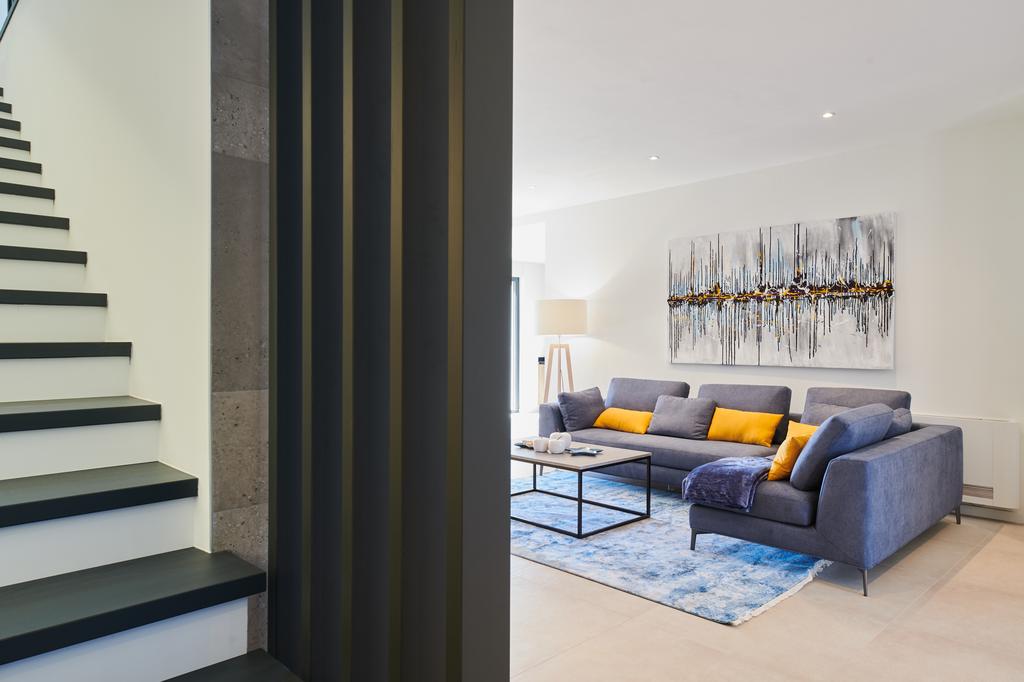 No rés-do-chão da moradia existe um corredor em open space, uma sala de estar, uma sala de jantar e uma kitchenette. Grandes superfícies de vidro eles permitem que você assista o que está acontecendo no terraço e na piscina, tanto da cozinha quanto da sala de jantar. No térreo há um quarto duplo com cama de casal e banheiro privativo. Uma máquina de lavar, uma chaleira e um pequeno banheiro de serviço também estão disponíveis. Escadas internas levam ao andar superior onde estão três quartos duplos com seu próprio banheiro e varanda francesa.