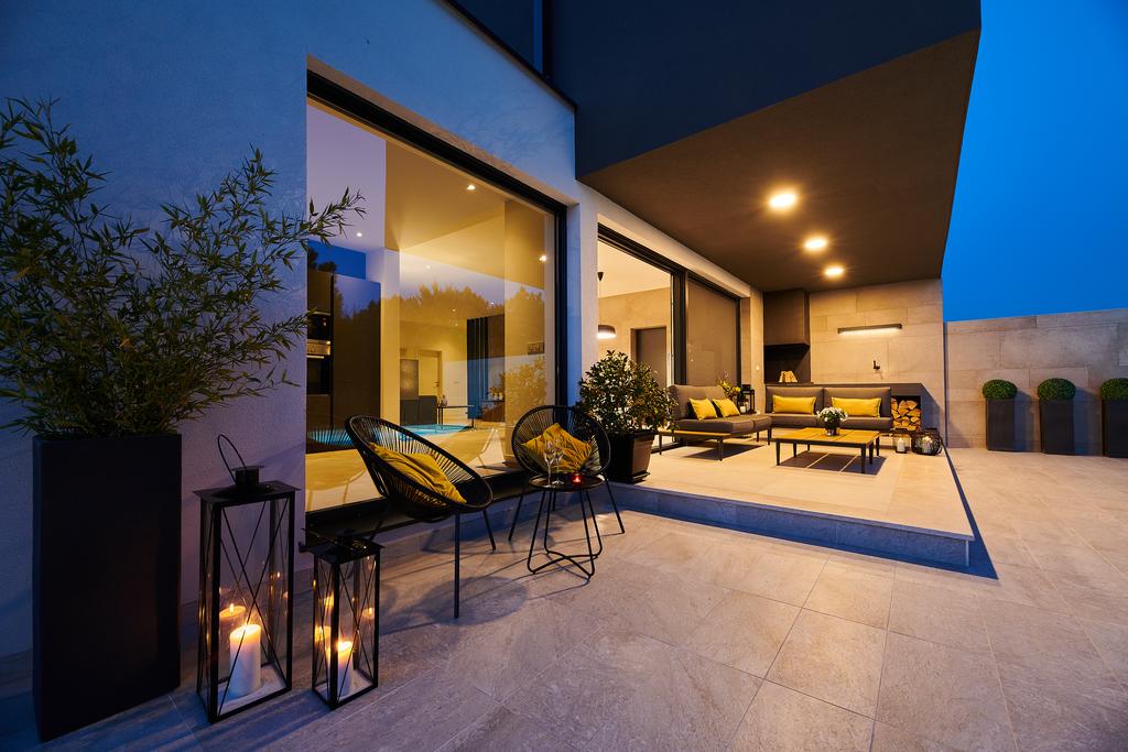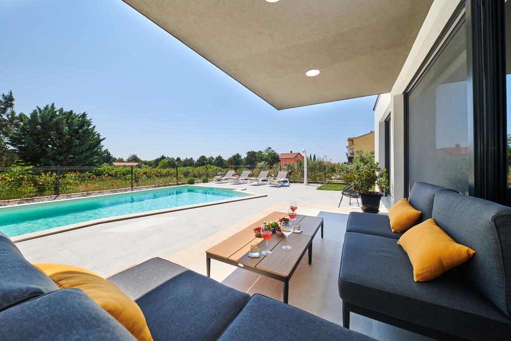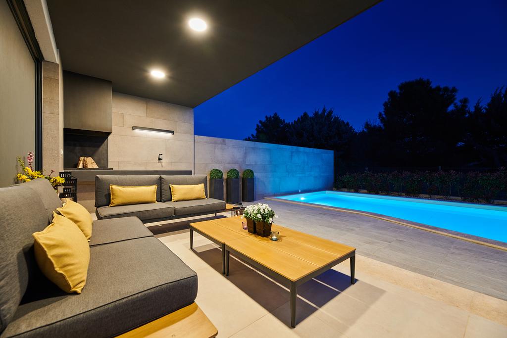Vila Contessa abrange 450 metros quadrados. Você certamente ficará encantado com sua imagem externa, que o adorna um jardim rico em verdura, pomar e piscina exterior no tamanho de 37 metros quadrados. O terraço ao ar livre está equipado com móveis modernos e confortáveis, de onde você também pode apreciar a vista parte do mar Adriático. As noites quentes de verão são especialmente mágicas, com lanternas acesas e cheiro de churrasco. À beira da piscina também há 8 espreguiçadeiras e um chuveiro com aquecedor solar de água.