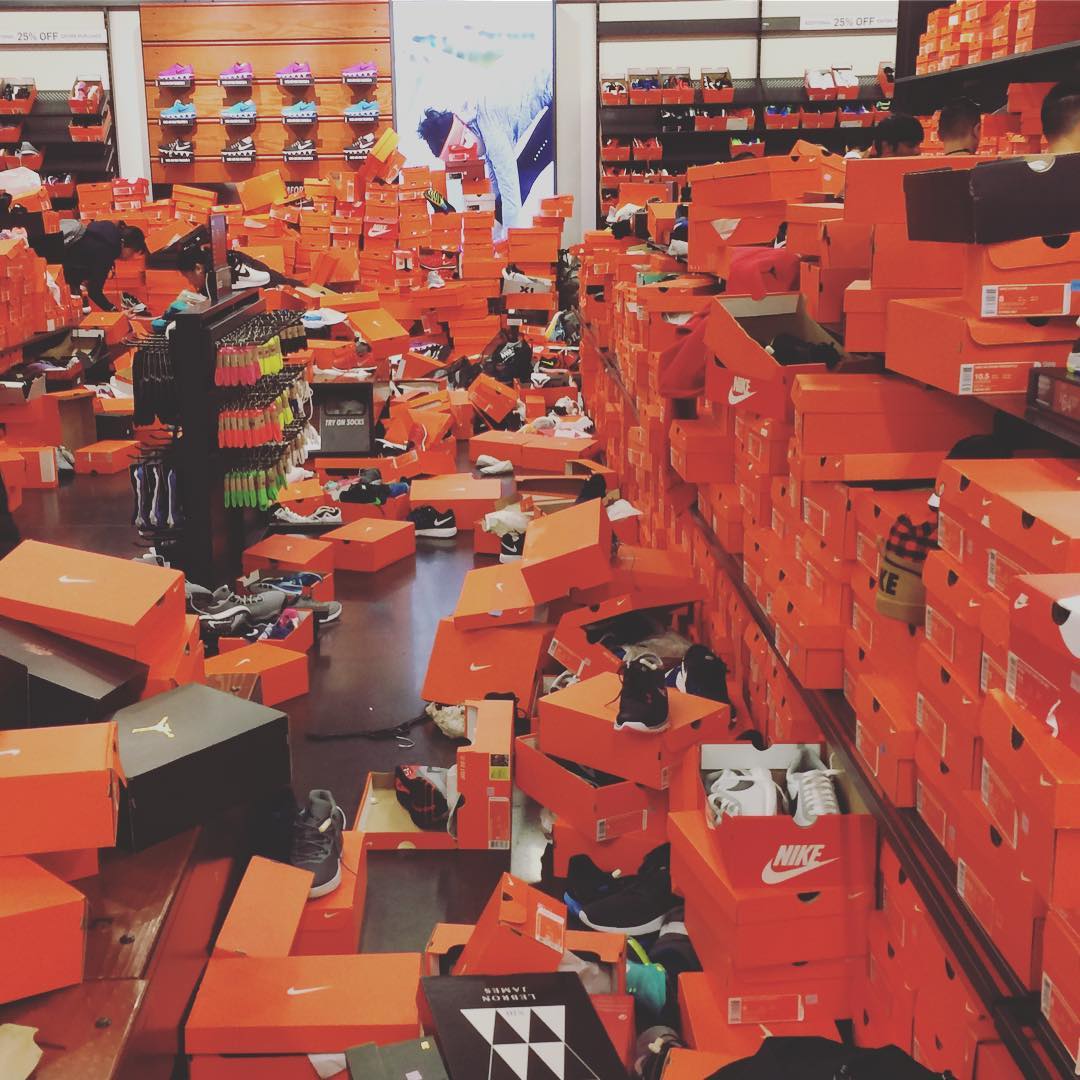 Como a maioria das lojas, é Loja da Nike em Seattle ofereceu descontos especiais naquele dia e experimentou em primeira mão transparência dos compradores, que eles deixaram para trás destruição real, 'vale' um terremoto de magnitude pelo menos sete na escala Richter.