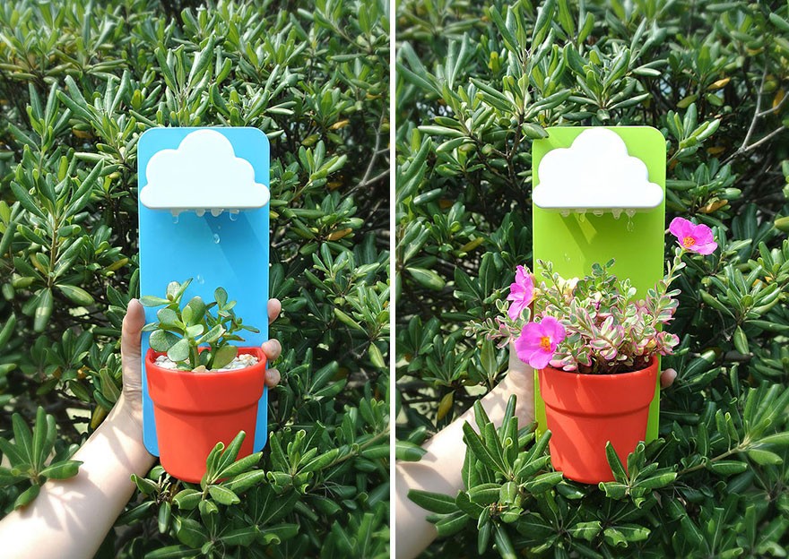 Simpatični viseči lonci za rože “Rainy Pot”, ki so jih oblikovali pri Daily Life Lab-u, imajo vgrajen sistem za zalivanje rož v obliki oblaka. Rožo, posajeno v prikupnem cvetličnem lončku, zalijemo tako, da vodo vlijemo v odprtino filtra na vrhu oblaka. Ta je oblikovan tako, da vodo spremeni v deževne kapljice, ki enakomerno “dežujejo” na rožo in ji nudijo potrebno tekočino za rast.